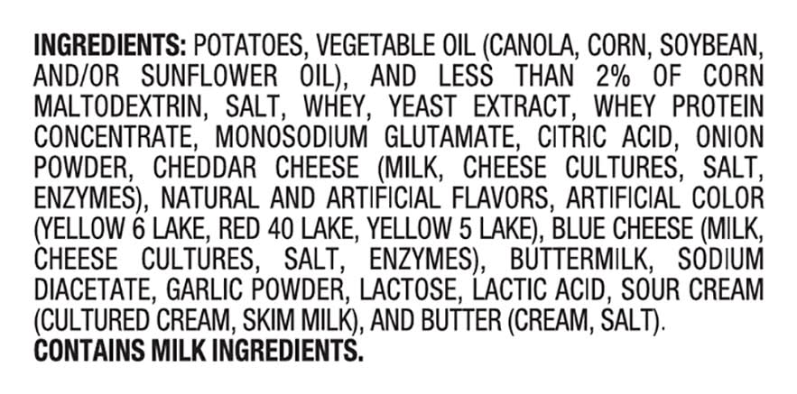Ingredients: Potatoes, Vegetable Oil (Canola, Corn, Soybean, and/or Sunflower Oil), and Less than 2% of Corn Maltodextrin, Salt, Whey, Yeast Extract, Whey Protein Concentrate, Monosodium Glutamate, Citric Acid, Onion Powder, Cheddar Cheese (Milk, Cheese Cultures, Salt, Enzymes), Natural and Artificial Flavors, Artificial Color (Yellow 6 Lake, Red 40 Lake, Yellow 5 Lake), Blue Cheese (Milk, Cheese Cultures, Salt, Enzymes), Buttermilk, Sodium Diacetate, Garlic Powder, Lactose, Lactic Acid, Sour Cream (Cultured Cream, Skim Milk), and Butter (Cream, Salt) Contains: Milk, Lactose, Corn, Soybeans