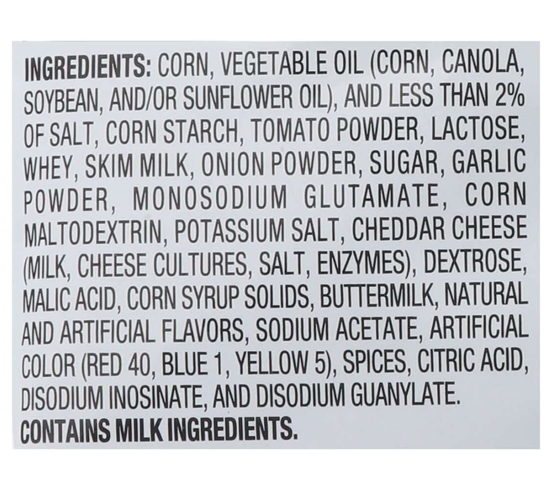 Ingredients: Corn, Vegetable Oil (Corn, Canola, Soybean, and/or Sunflower Oil), and Less than 2% of Salt, Corn Starch, Tomato Powder, Lactose, Whey, Skim Milk, Onion Powder, Sugar, Garlic Powder, Monosodium Glutamate, Corn Maltodextrin, Potassium Salt, Cheddar Cheese Milk, Cheese Cultures, Salt, Enzymes), Dextrose, Malic Acid, Corn Syrup Solids, Buttermilk, Natural and Artificial Flavors, Sodium Acetate, Artificial Color (Red 40, Blue 1, Yellow 5), Spices, Citric Acid, Disodium Inosinate, and Disodium Guanylate Contains: Corn, Lactose, Milk, Soybeans