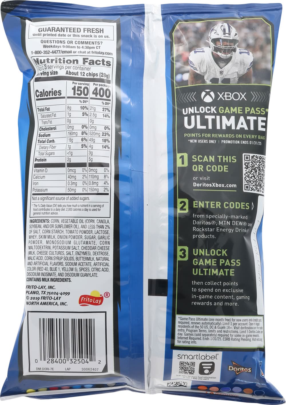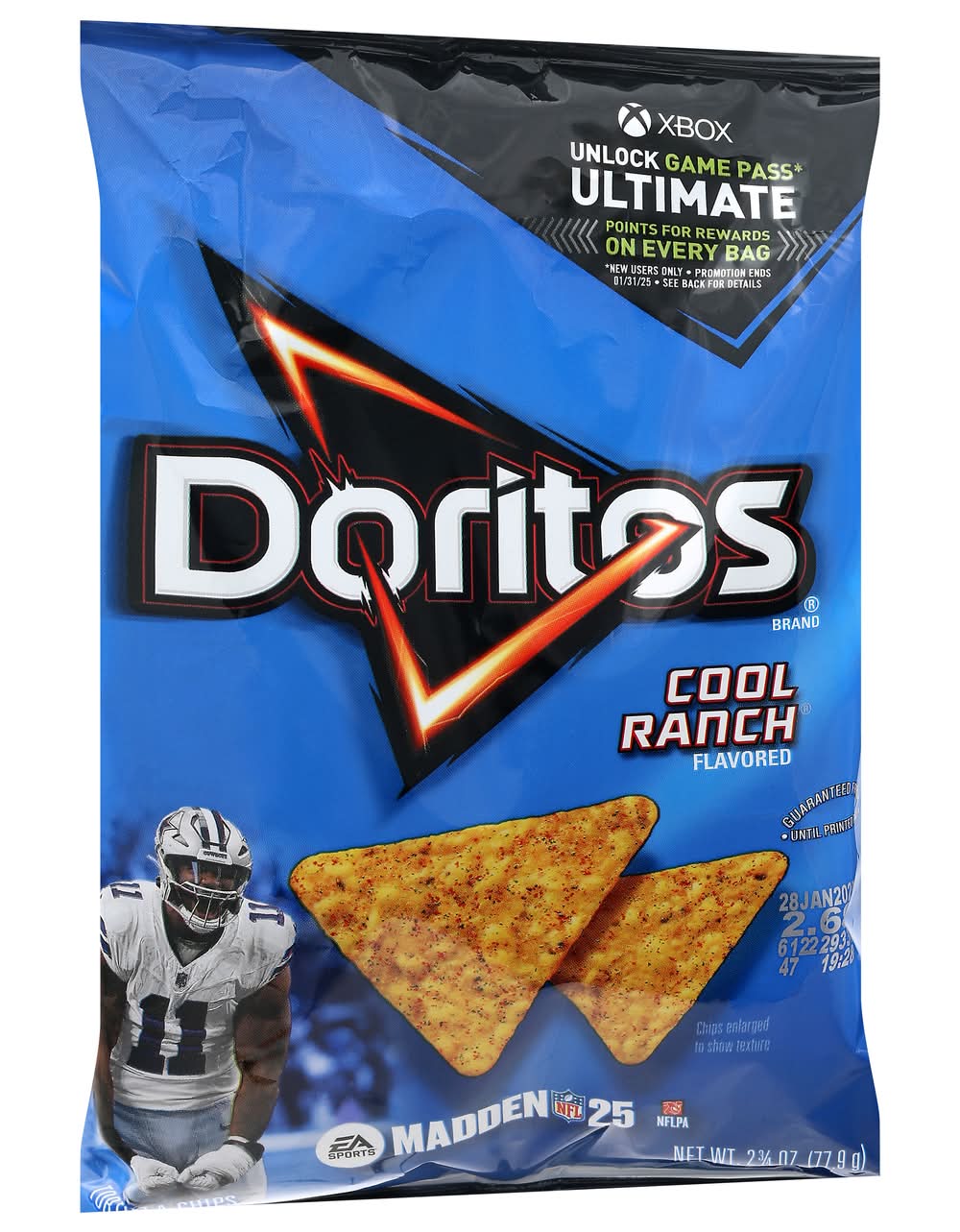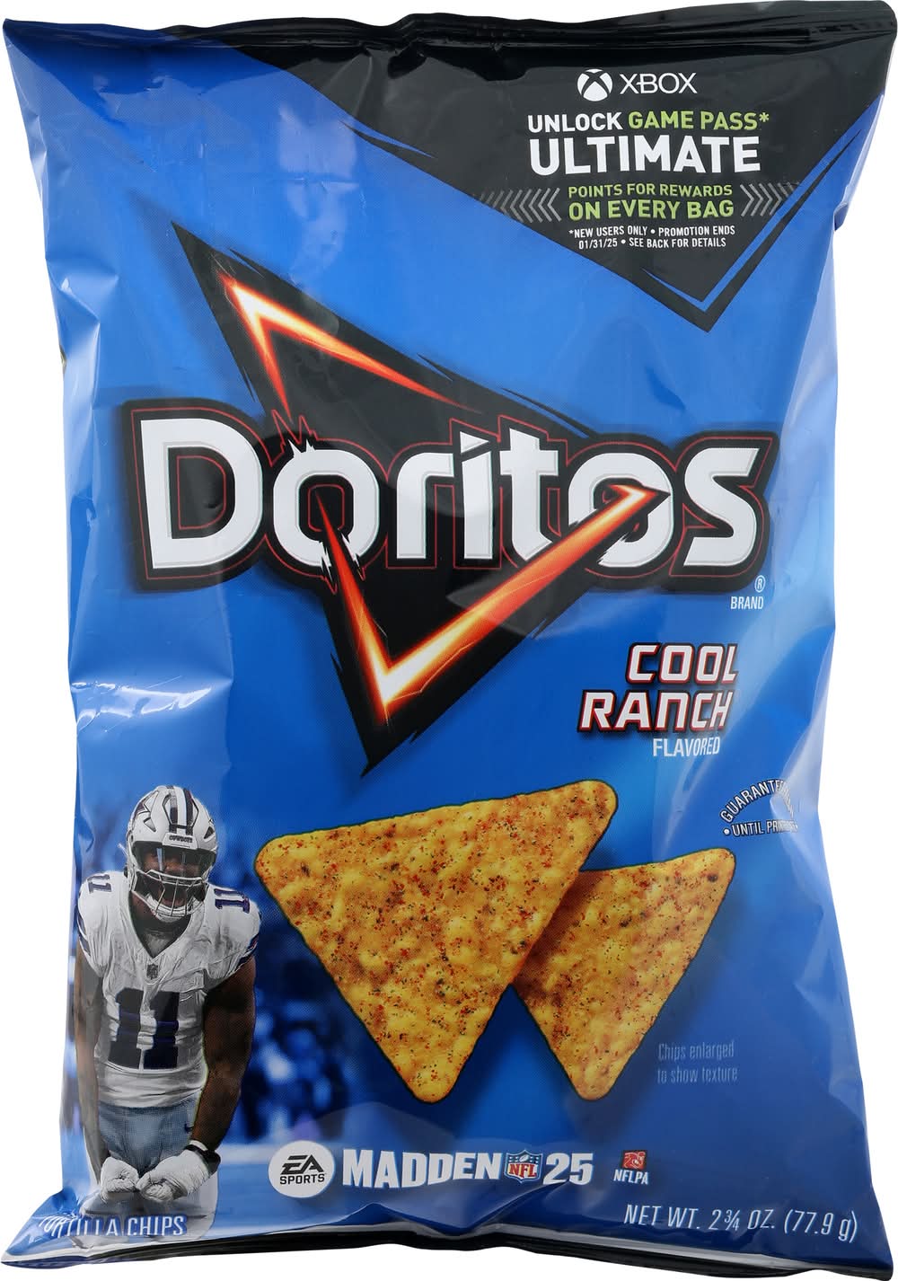 The DORITOS brand is all about boldness. If you're up to the challenge, grab a bag of DORITOS tortilla chips and get ready to make some memories you won't soon forget. It's a bold experience in snacking and beyond. Bite into crunchy & flavorful chips with Dorritos Flavor on Another Level Includes 1 (2.75 oz) Bag of Doritos Cool Ranch Flavored Tortilla Chip Flavor: Cool ranch