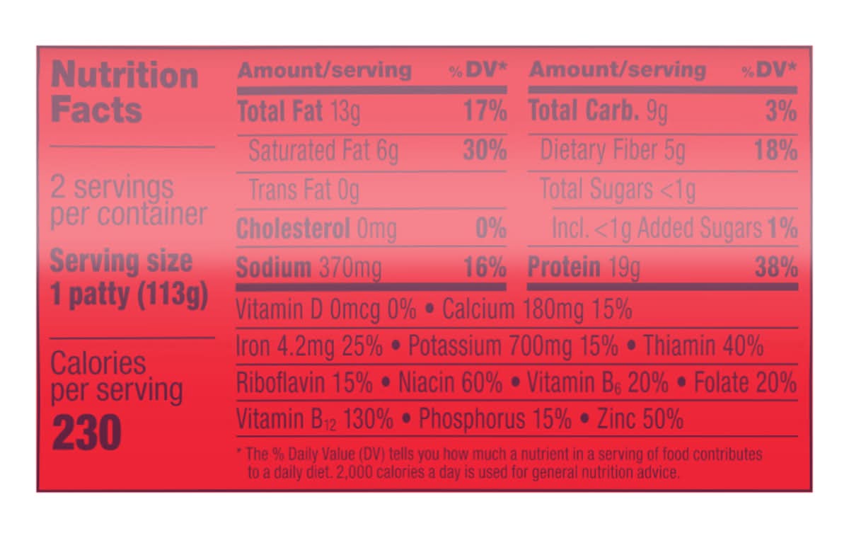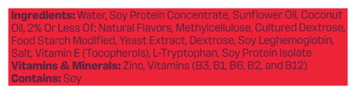 Ingredients: Ingredients: Water, Soy Protein Concentrate, Sunflower Oil, Coconut Oil, 2% Or Less Of: Natural Flavors, Methylcellulose, Cultured Dextrose, Food Starch Modified, Yeast Extract, Dextrose, Soy Leghemoglobin, Salt, Vitamin E (Tocopherols), L-Tryptophan, Soy Protein Isolate Vitamins & Minerals: Zinc, Vitamins (B3, B1, B6, B2, and B12) Contains: Soy