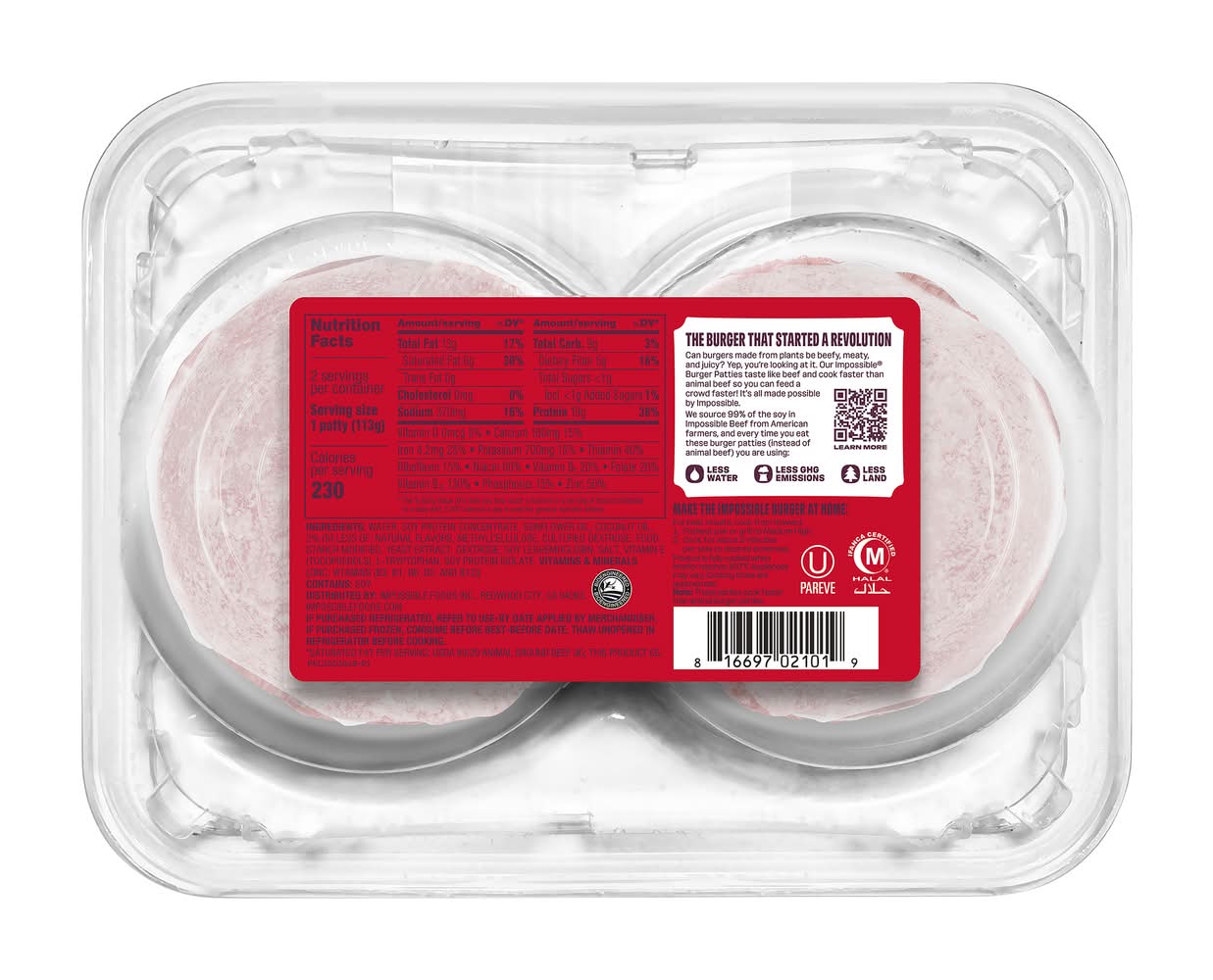 USDA 80/20 animal ground beef 9 g; this product 6 g. Bioengineered. Meat from plants. No animal hormones or antibiotics. The Burger That Started A Revolution: Can a burger made from plants be beefy, meaty and irresistibly juicy? Yep, you're looking at it. Cooking up these Impossible burger patties is a mouth-watering way to do better for the planet. Tastes like beef and cooks faster than animal beef so you can feed your hungry crowd fast! It's all made possible by Impossible. ImpossibleFoods.com. Scan to learn more. We source 99% of the soy in Impossible Beef from American farmers, and every time you eat these burger patties (instead of animal beef) you are using approximately: 92% less water. 91% less GHG emissions. 96% less land. Flavor: Beef