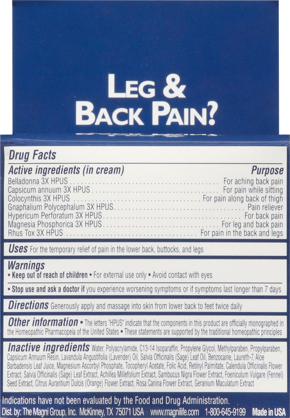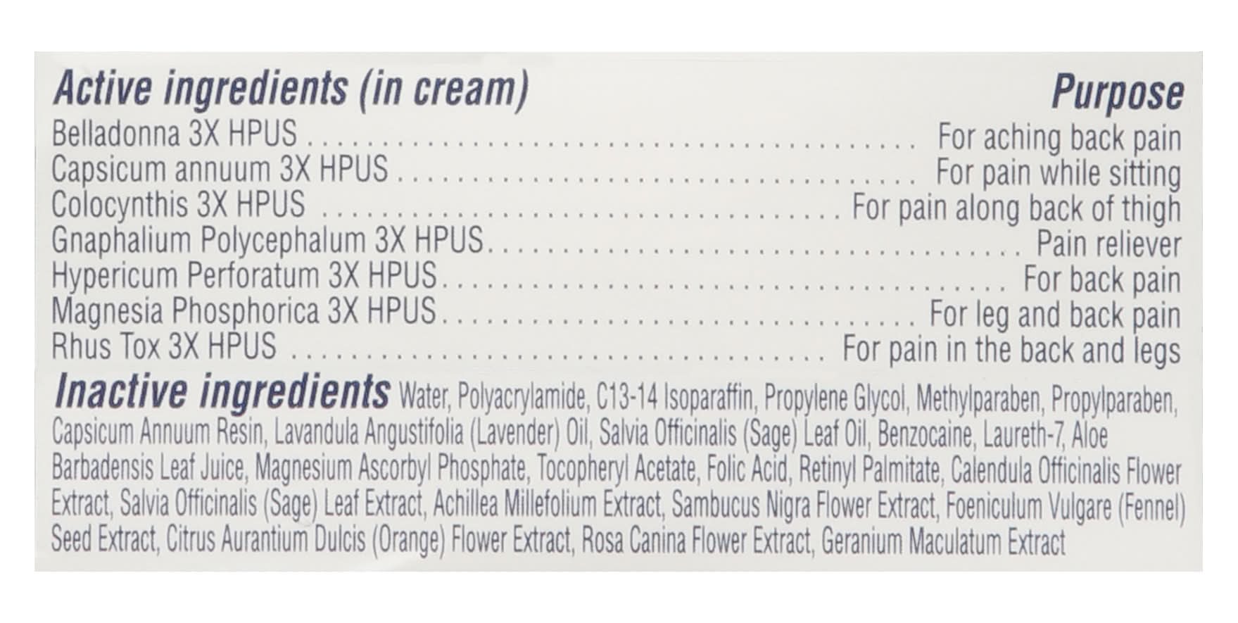 Ingredients: In Cream Active Ingredients: Belladonna 3X HPUS, For Aching Back Pain; Capsicum Annuum 3X HPUS, For Pain While Sitting; Colocynthis 3X HPUS, For Pain Along Back of Thigh; Gnaphalium Polycephalum 3X HPUS, Pain Reliever; Rhus Tox 3X HPUS, For Pain in the Back and Legs. Inactive Ingredients: Water, Polyacrylamide, C13-14 Isoparaffin, Propylene Glycol, Methylparaben, Propylparaben, Capsicum Annuum Resin, Lavandula Angustifolia (Lavender) Oil, Salvia Officinalis (Sage) Leaf Oil, Benzocaine, Laureth-7, Aloe Barbadendsis Leaf Juice, Magnesium Ascorbyl Phosphate, Tocopheryl Acetate, Folic Acid, Retinyl Palmitate, Calendula Officinalis Flower Extract, Salvia Officinalis (sage) Leaf Extract, Achillea Millefolium Extract, Sambucus Nigra Flower Extract, Foeniculum Vulgare (Fennel) Seed Extract, Citrus Aurantium Dulcis (Orange) Flower Extract, Rosa Canina Flower Extract, Geranium Maculatum Extract