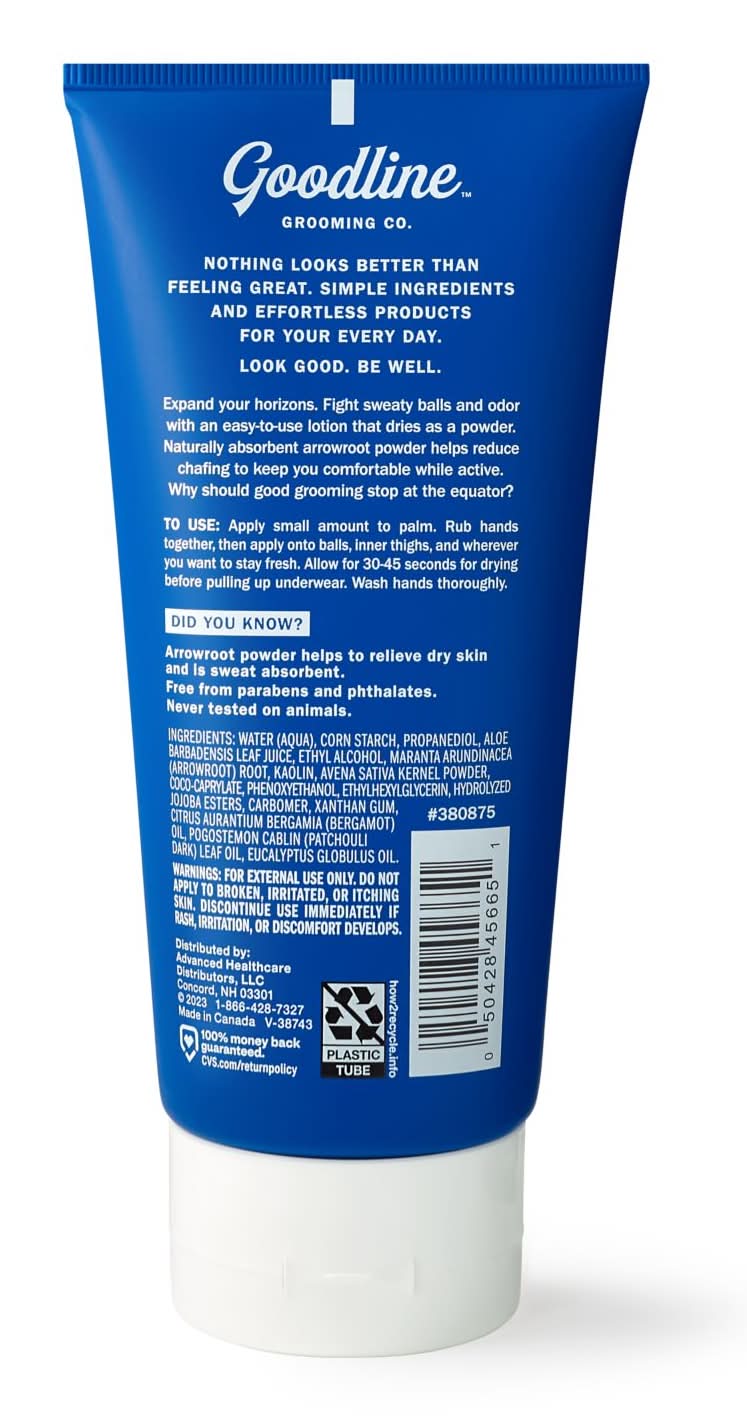 Expand your horizons. Fight sweaty balls and odor with an easy-to-use lotion that dries as a powder. Naturally absorbant arrowroot powder helps reduce chafting to keep you comfortable while active. Why should good grooming stop at the equator.