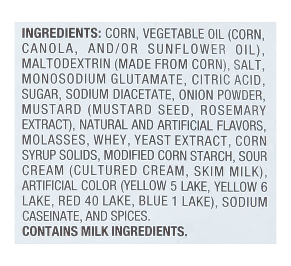 Ingredients: Corn, Vegetable Oil (Corn Canola and/or Sunflower Oil), Maltodextrin (Made from Corn), Salt, Monosodium Glutamate, Citric Acid, Sugar, Sodium Diacetate, Onion Powder, Mustard (Mustard Seed Rosemary Extract), Natural and Artificial Flavors, Molasses, Whey, Yeast Extract, Corn Syrup Solids, Modified Corn Starch, Sour Cream (Cultured Cream Skim Milk), Artificial Color (Yellow 5 Lake Yellow 6 Lake Red 40 Lake Blue 1 Lake), Sodium Caseinate, and Spices Contains: Corn, Mustard, Milk