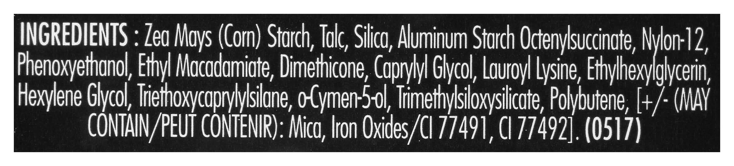 Ingredients: Zea Mays (Corn) Starch, Talc, Silica, Aluminum Starch Octenylsuccinate, Nylon-12, Phenoxyethanol, Ethyl Macadamiate, Dimethicone, Capylyl Glycol, Lauroyl Lysine, Ethylhexylglycerin, Hexylene Glycol, Triethoxycaprylylsilane, O-Cymen-5-Ol, Trimethylsiloxysilicate, Polybutene, [+/-(May Contain): Mica, Iron Oxides/CI 77491, Cl 77492].
