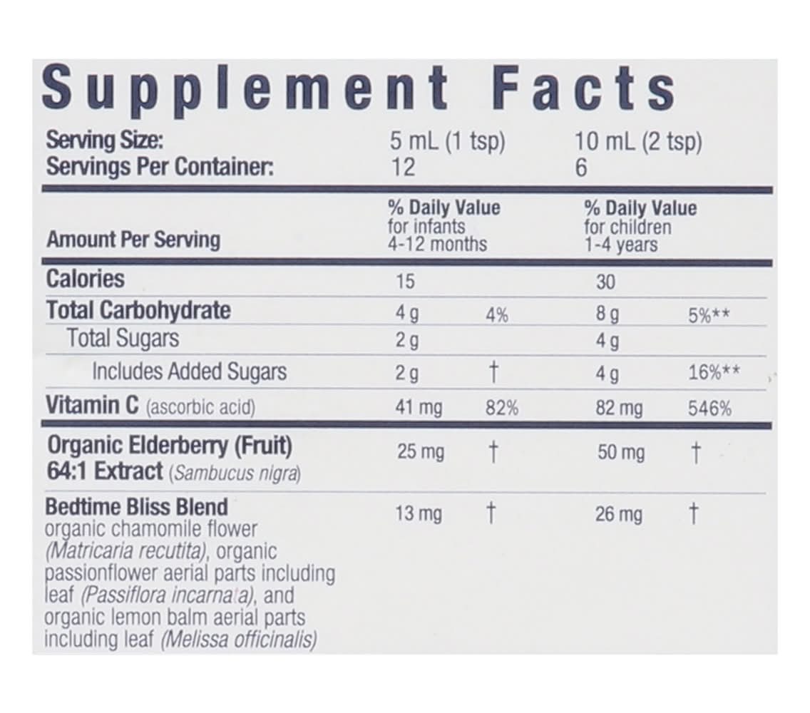 Ingredients: Bedtime Bliss Blend: Organic Chamomile Flower (Matricaria Recutita), Organic Passionflower Aerial Parts Including Leaf (Passiflora Incarnata), and Organic Lemon Balm Aerial Parts Including Leaf (Melissa Officinalis). Other Ingredients: Organic Vegetable Glycerin, Organic Agave Syrup, Water, Citric Acid