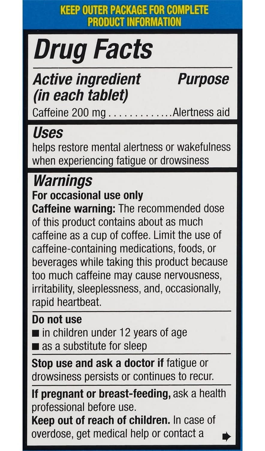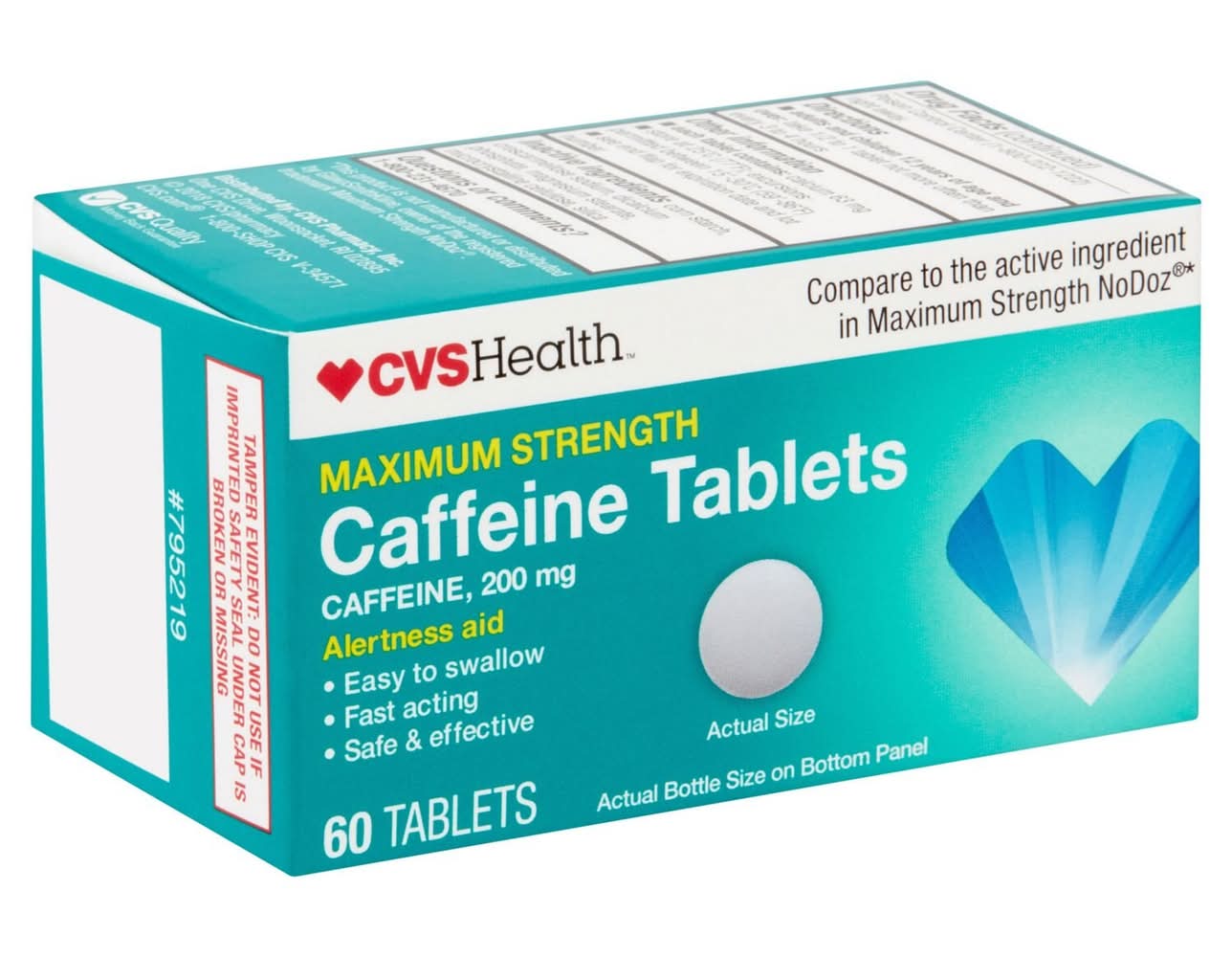 CVS™ Caffeine Alertness Aid helps restore mental alertness or wakefulness when experiencing fatigue or drowsiness. At CVS, we believe healthier happens together. That's why we're committed to caring for your well-being, bringing you trusted CVS products that support a healthier, happier life. Join us on the journey to better health, one product at a time. Caffeine, 200 mg For mental alertness Safe and effective 60 tablets See Drug Facts Label for complete directions and other important information prior to use Please see drug facts panel disclaimer New Heart, New Look: We’ve redesigned our packaging with you in mind. Packaging may vary during this time 100% money-back guarantee on Our CVS Brands. If you are not 100% satisfied with a CVS Pharmacy private brand product, you can return it for free (some exclusions apply*). For more details regarding Our CVS Brands return policy, please visit https://www.cvs.com/retail/help/return_policy.