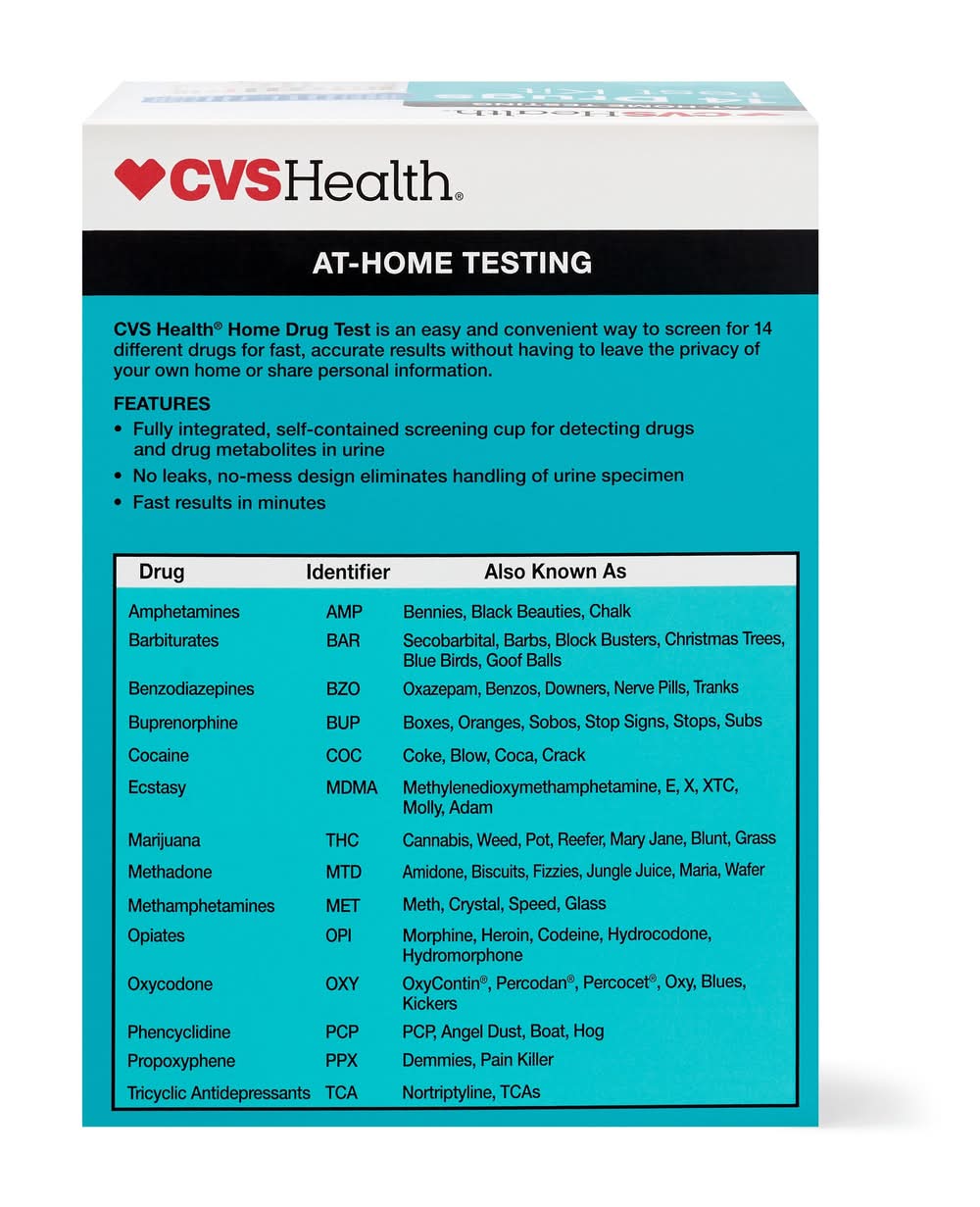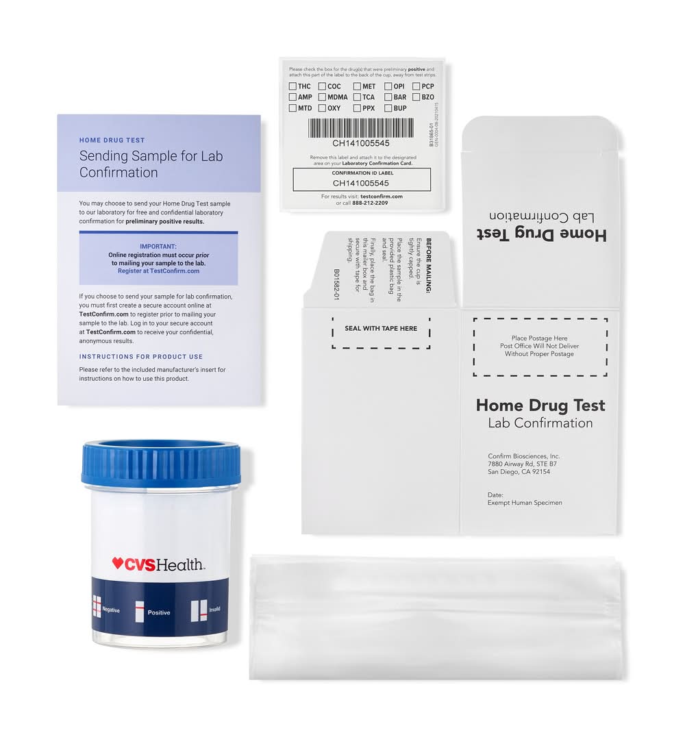 CVS Health® Home Drug Test is an easy and convenient way to screen for marijuana for fast, accurate results without having to leave the privacy of your own home or share personal information. Testing for: Marijuana. Fully integrated, self-contained screening cap for detecting drugs and drug metabolites in urine. No leaks, no-mess design eliminates handling of urine specimen. The results are immediate, and you can mail in a positive result for it to be confirmed by the lab. Up to 99% accurate. Includes: 1 Individually wrapped CVS Health® Home Drug Test urine specimen cup, 1 Confidential confirmation ID label, 1 Plastic sealable bag, 1 Pre-addressed mailing box (Package is not prepaid. You must pay for shipping.) Accurate: Drug Confirm® Home Urine Drug Test results are up to 99% accurate. Instant: Results are available within 5-10 minutes of taking the test. Easy: Simple 3 step instructions make this test a breeze to perform in the privacy of your office or home. Safe: Tests are FDA Approved and CLIA Waived for over-the-counter and at-home use. Confirmed: Lab confirmation and the needed shipping materials, including a prepaid shipping label, are included with your kit. Confidential: No personal information is needed to take the initial test Drug: Marijuana Identifier: THC Also Known As: Cannibus, Weed, Pot, Reefer, Mary Jane, Blunt, Grass