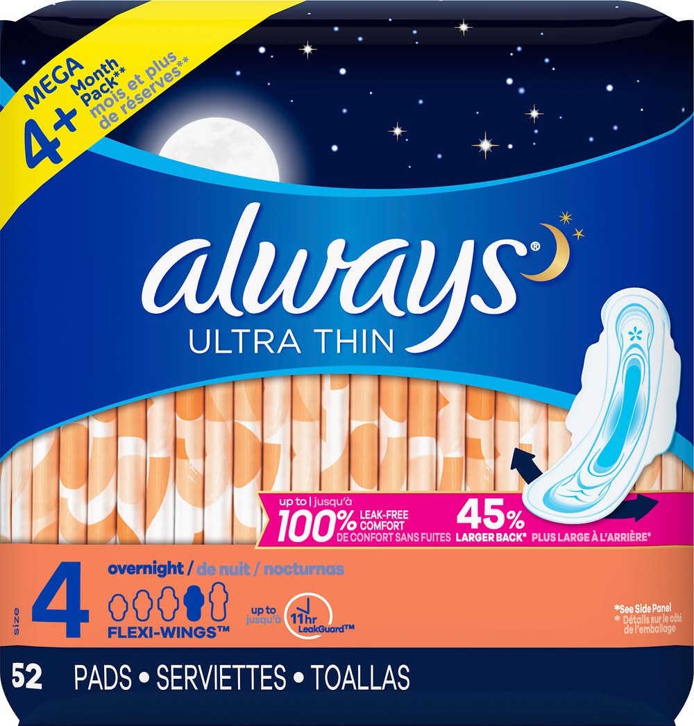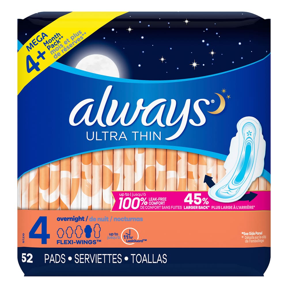 Always Ultra Thin Overnight Flexi-Wings Sanitary Pads, 4 (185 oz, 52 ct)