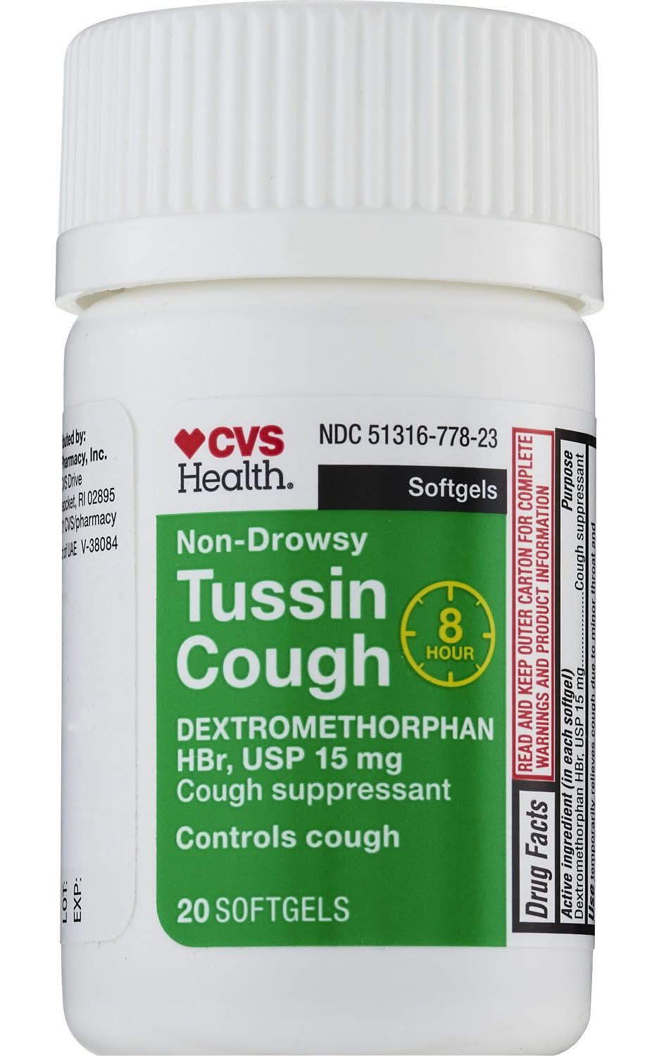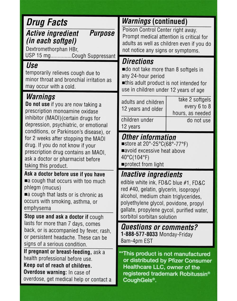 Compare to the active ingredient in Robitussin Cough Gels (this product is not manufactured or distributed by Wyeth Consumer Healthcare, owner of the registered trademark Robitussin Cough Gels). Dextromethorphan HBr - cough suppressant. Liquid-filled capsules. Controls coughs up to 8 hours. CVS pharmacist recommended. Product of Canada. HSA/FSA Eligible Tussin cough softgels Temporarily relieves coughs up to eight hours 20 softgels per bottle