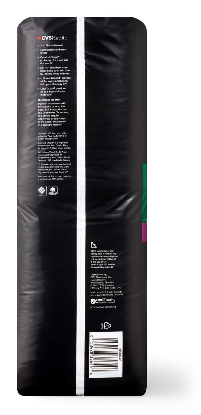 CVS Health maximum absorbency women's underwear are comfortable and easy to use! The Dri-Fit absorbent core helps keep your skin drier by locking away wetness. The cotton enhanced surface wicks away moisture to help your skin stay dry. Its Odor Guard technology provides up to 8 hours of odor protection, so you can feel confident all day long. Comfort-Shape fit is soft and discreet. Reference the absorbency chart on the packaging to ensure the perfect fit for your body. HSA/FSA Eligible Comfortable and easy to use! Dri-Fit absorbent core helps keep your skin drier Locks away wetness