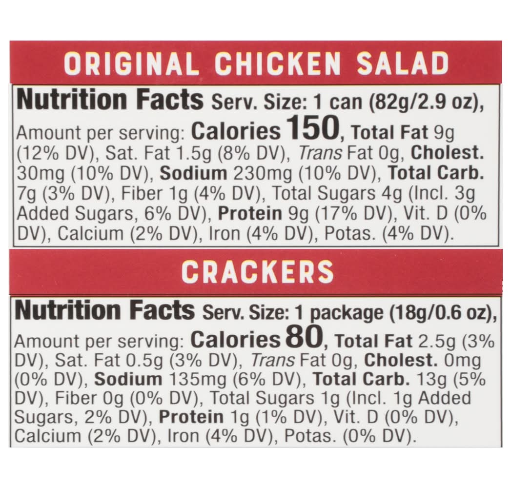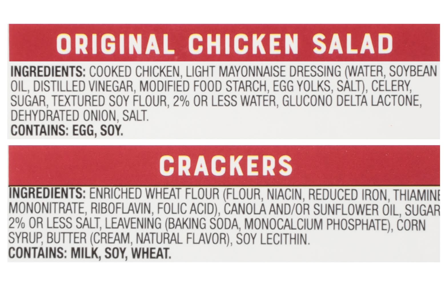 Ingredients: Chicken Salad: Cooked Chicken, Light Mayonnaise Dressing (Water, Soybean Oil, Distilled Vinegar, Modified Food Starch, Egg Yolks, Salt), Celery, Sugar, Water Chestnuts, Textured Soy Flour, Contains 2% or Less Water, Glucono Delta Lactone, Onion, Salt. Crackers: Enriched Flour (Wheat Flour, Niacin, Reduced Iron, Thiamine Mononitrate (B1), Riboflavin (B2), Folic Acid), Canola Oil, Sugar, Contains 2% or Less Salt, Corn Syrup, Baking Soda, Butter (Cream, Natural Flavor), Soy Lecithin, Monocalcium Phosphate. Contains: Eggs, Soybeans, Celery, Tree Nuts, Chestnuts, Milk, Wheat