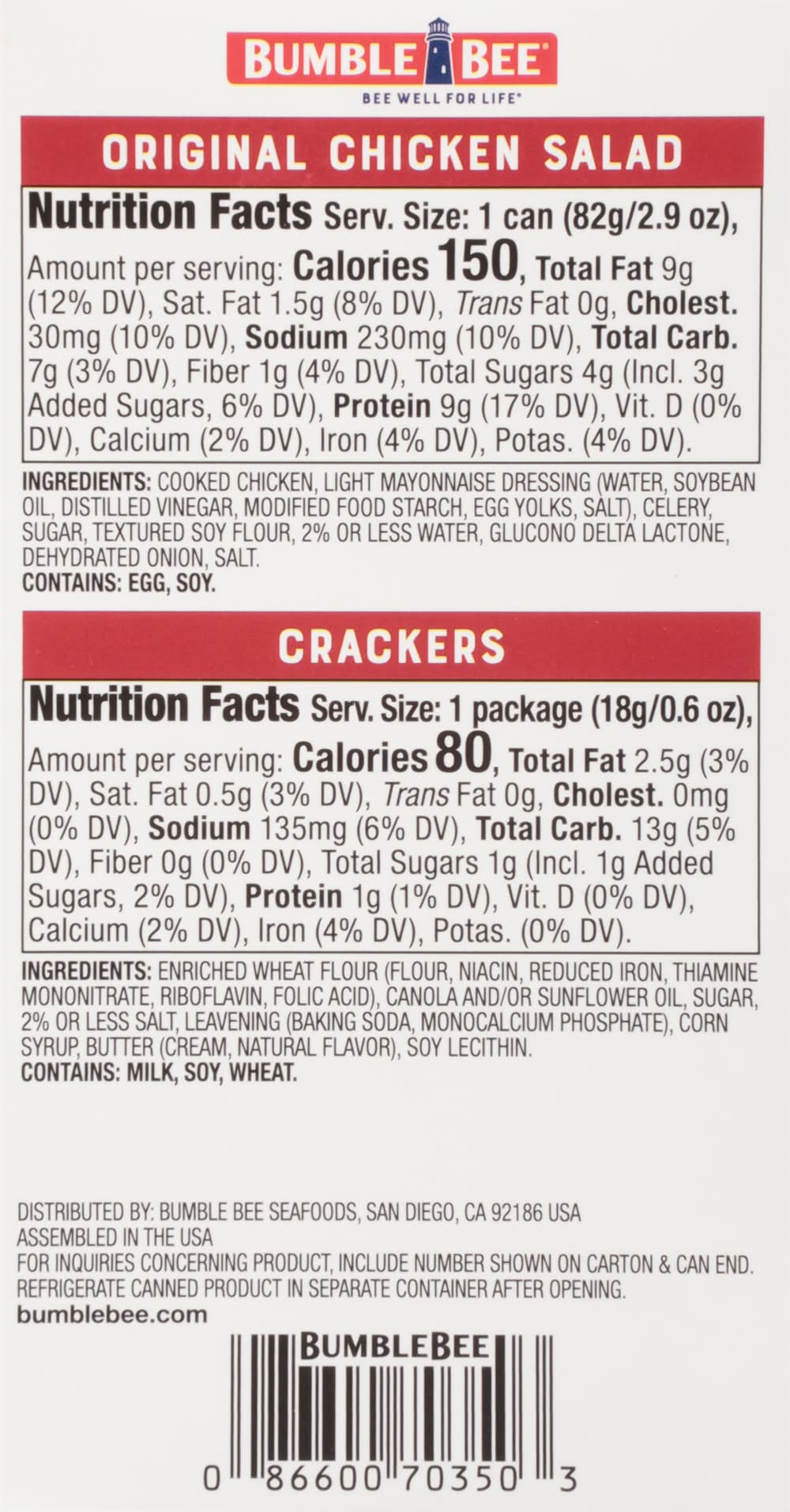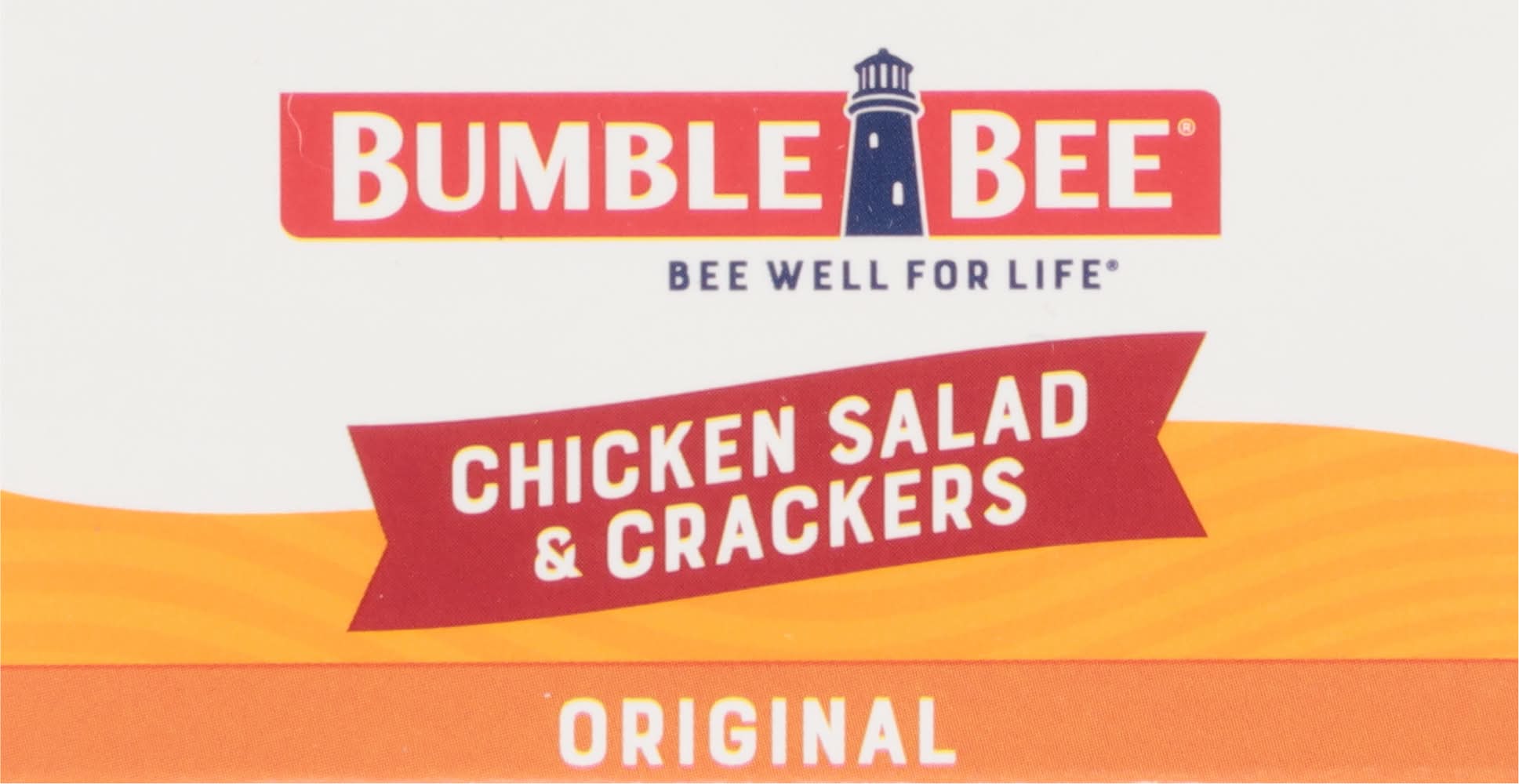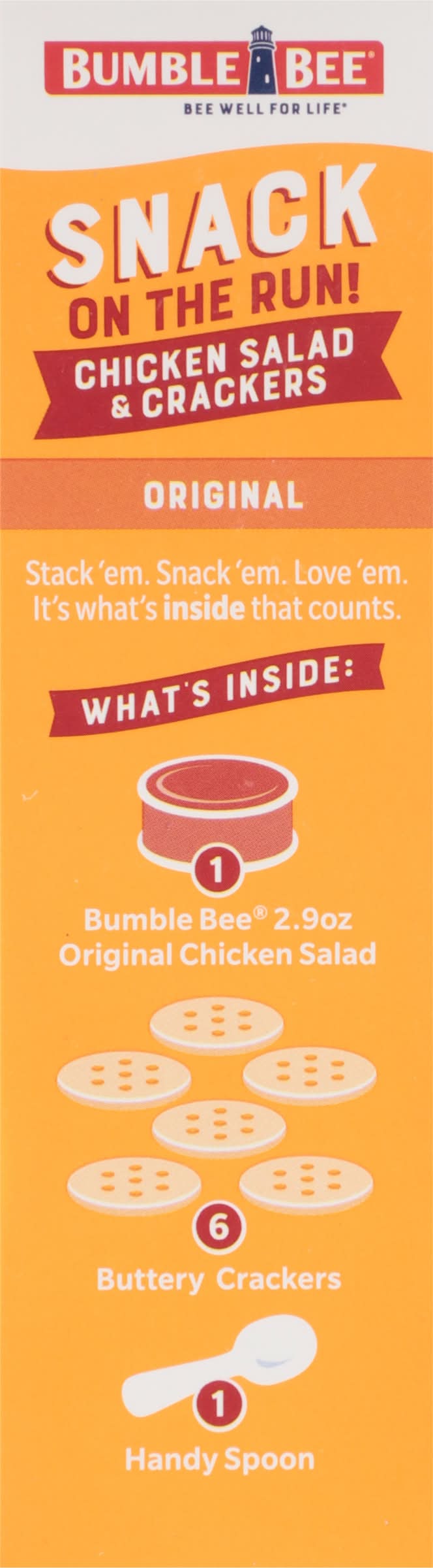 Tasty protein . Great flavors. Crisp crackers. And a handy spoon for instant gratification. Already mixed - Ready-to-go. Open up and say yum. For inquiries concerning product, include number shown on carton & can end. It's what's inside that counts. Premium chicken. So tender. So chunky. Bumble Bee Chicken Salad. Buttery crackers. 1. Handy spoon. For inquiries concerning product, include number shown on carton & can end. Bumble Bee Seafoods, San Diego, CA, 92186