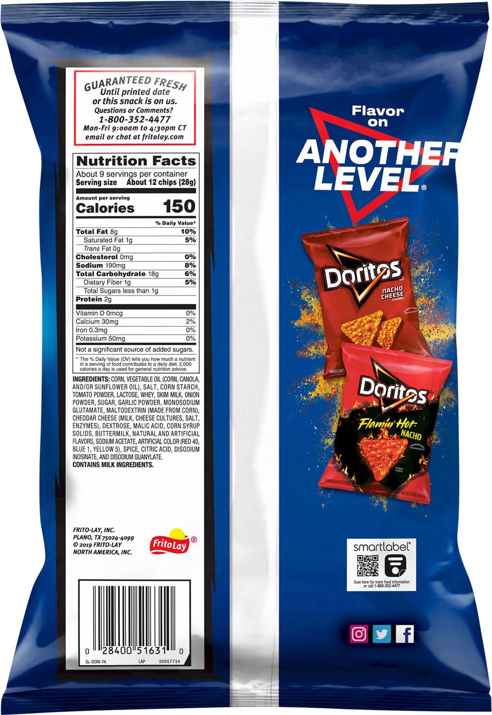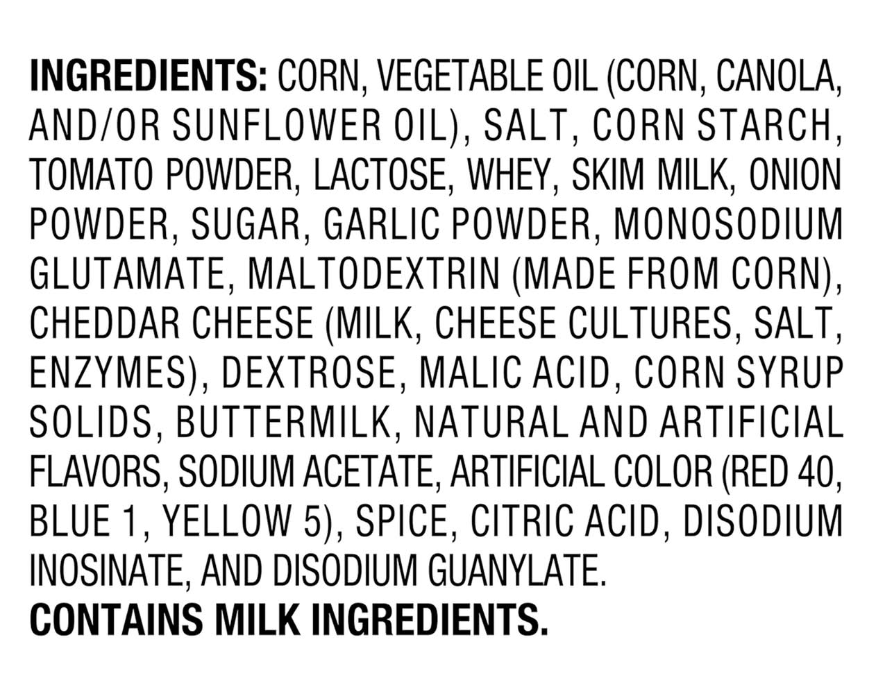 Ingredients: Corn, Vegetable Oil (Corn, Canola, Soybean, and/or Sunflower Oil), and Less than 2% of Salt, Tomato Powder, Buttermilk, Lactose, Onion Powder, Sugar, Skim Milk, Cheddar Cheese (Milk, Cheese Cultures, Salt, Enzymes), Garlic Powder, Corn Maltodextrin, Potassium Salt, Monosodium Glutamate, Whey, Dextrose, Malic Acid, Natural and Artificial Flavors, Sodium Acetate, Artificial Color (Red 40, Blue 1, Yellow 5), Spices, Disodium Inosinate, Disodium Guanylate, and Citric Acid Contains: Milk, Lactose, Soybeans