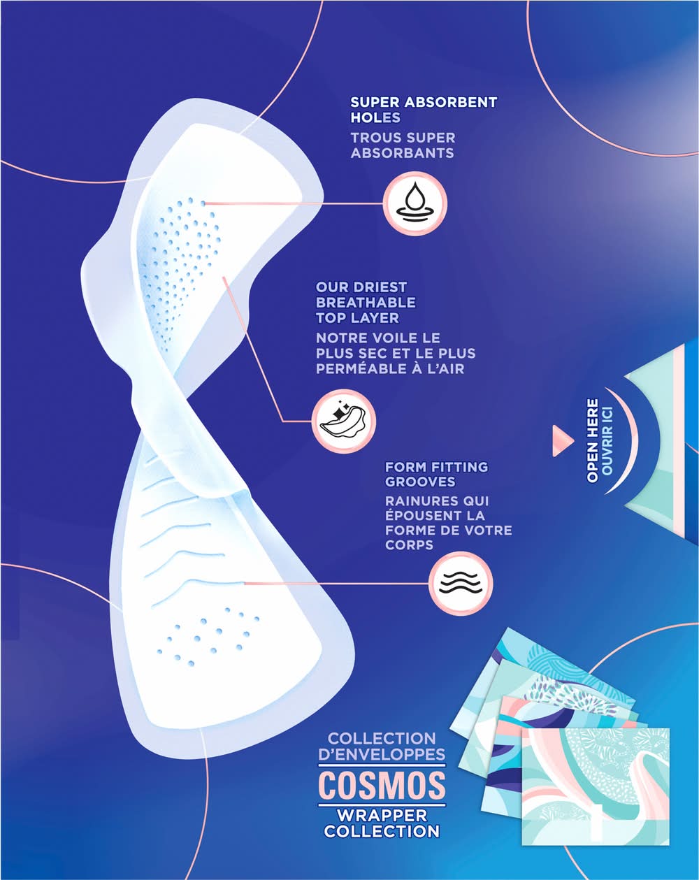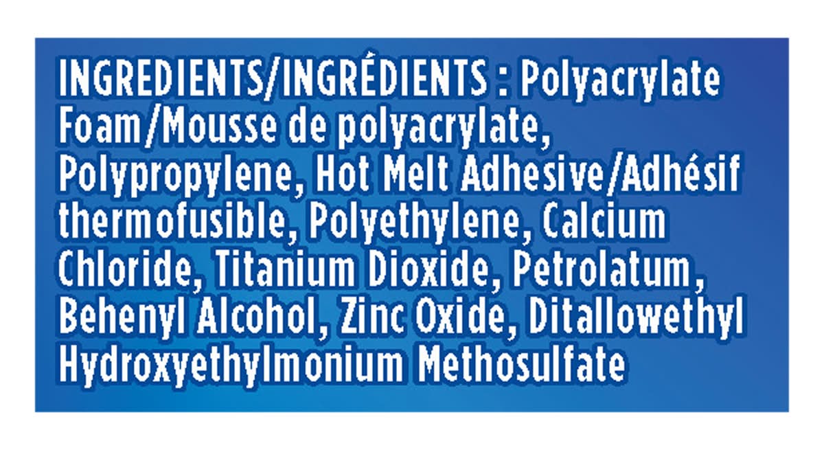 Ingredients: Polyacrylate Foam/Mousse De Polyacrylate, Polypropylene, Hot Melt Adhesive/Adhesif Thermofusible, Polyethylene, Calcium Chloride, Titanium Dioxide, Petrolatum, Behenyl Alcohol, Zinc Oxide, Ditallowethyl Hydroxyethylmonium Methosulfate