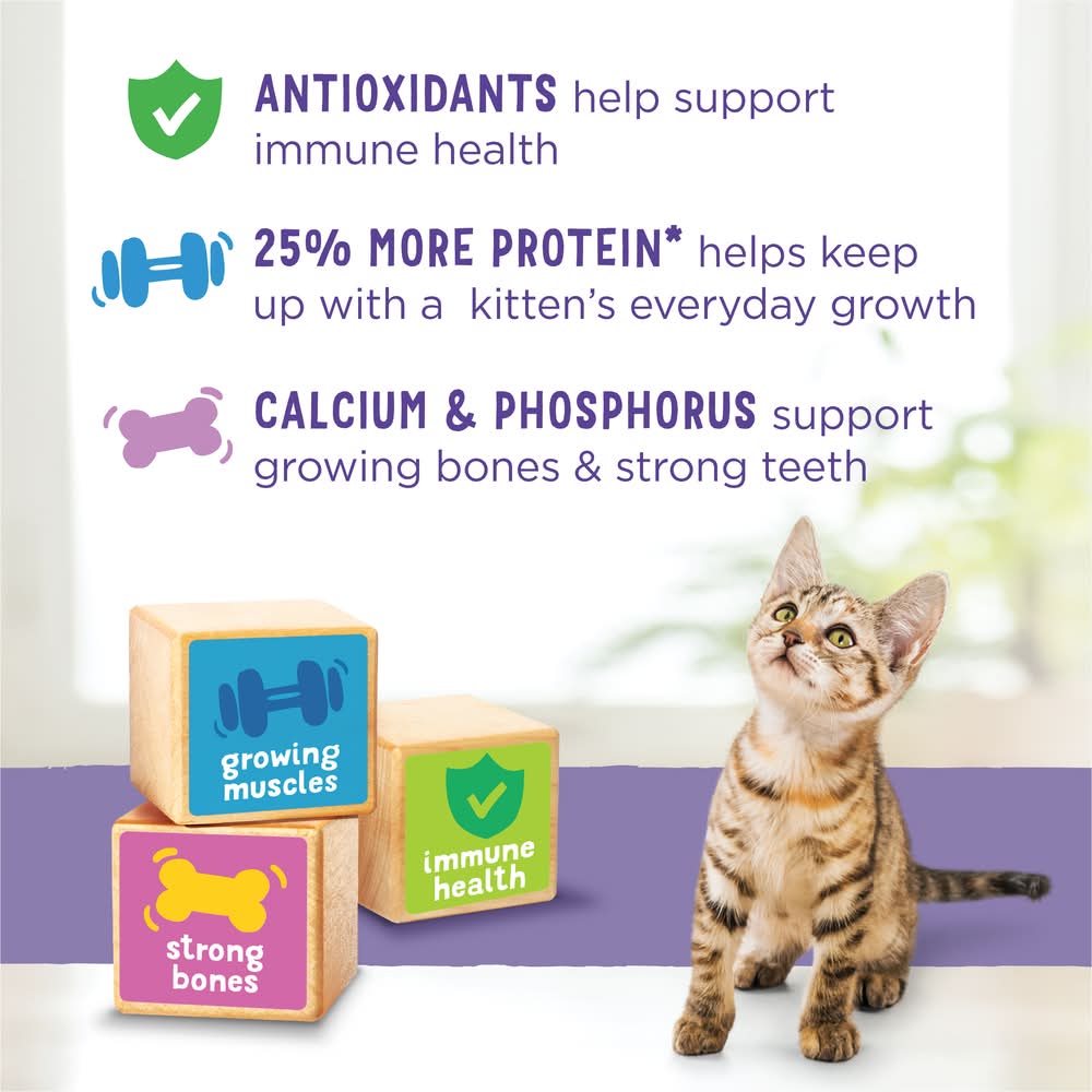 Directions for use: Recommended Daily Feeding Amounts: Age: 3-6 weeks; Total Daily Amount: 1/4 to 1/3 cup; Frequency: 3-4 times a day. Age: 7 weeks - 6 months; Total Daily Amount: 1/3 to 3/4 cup; Frequency: 3-4 times a day. Age: 7 months - 1 year; Total Daily Amount: 1/2 to 3/4 cup; Frequency: 2 times a day. Using a standard 8 oz measuring cup. Feeding Kittens: Kittens generally nibble solid foods at 3-4 weeks of age. Keep moistened Purina Kitten Chow Nurture available to these kittens at all times. Just add one part liquid to three parts Purina Kitten Chow Nurture, changing frequently to ensure freshness. After weaning, at 6-8 weeks of age, kittens will normally eat dry or moistened food at will. Start a self-feeding program, leaving food in dish at all times. Feeding amounts should be adjusted as necessary to help your kitten maintain an ideal body condition. Because kittens continue to develop throughout their first year, it’s important that they get the extra nutrition of Purina Kitten Chow Nurture for a full 12 months. After one year of age, transition to the Purina Cat Chow formula that’s right for your cat. Feeding for Reproduction: Purina Kitten Chow Nurture provides the extra nutrition needed by reproducing females in stages of gestation and lactation. Food consumption may vary during gestation, so feed the amount needed to maintain the pregnant female’s good body condition. Food intake may double or even quadruple during lactation. Feeding Tip: Changes in your cat’s diet should be made gradually to allow your cat to become accustomed to a new food. Substitute small amounts of the new food for the old food, gradually increasing the amount of the new food while decreasing the old food, over a period of 7 - 10 days. This gradual transition will help avoid dietary upsets. Provide adequate fresh water in a clean bowl daily. For your pet's health, see your veterinarian regularly. Storage recommendation: Store in a cool, dry place.