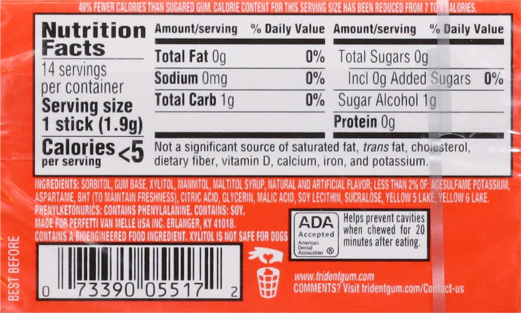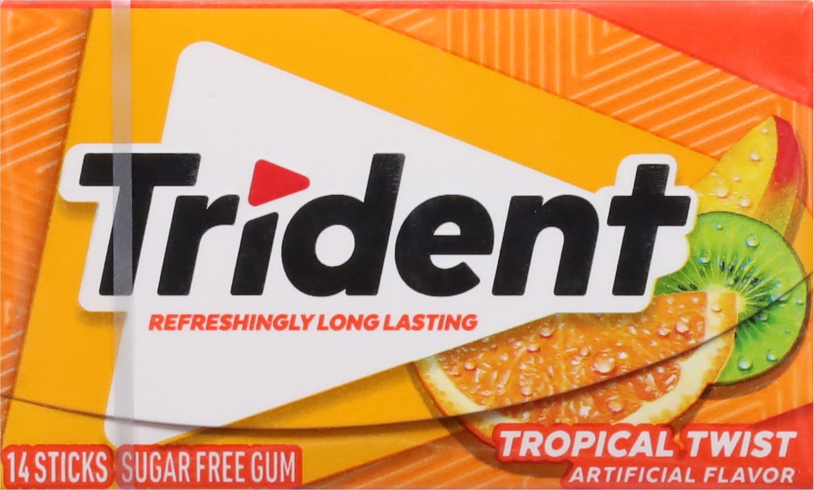 Trident Tropical Twist Sugar Free Gum, Made with Xylitol is like gum dancing with a hoola skirt on. With 30% fewer calories than sugared gum, Trident fruit flavored gum is sweetened with xylitol. Chewing Trident gum after eating and drinking cleans and protect teeth. Each pack of chewing gum contains 14 individually wrapped sticks. Trident Tropical Twist Sugar Free Gum with a delightful tropical flavor Contains 30% fewer calories than sugared gum and is sweetened with xylitol Helps clean and protect teeth when chewed after eating and drinking Convenient pack with 14 individually wrapped sticks for on-the-go freshness Flavor: Tropical twist