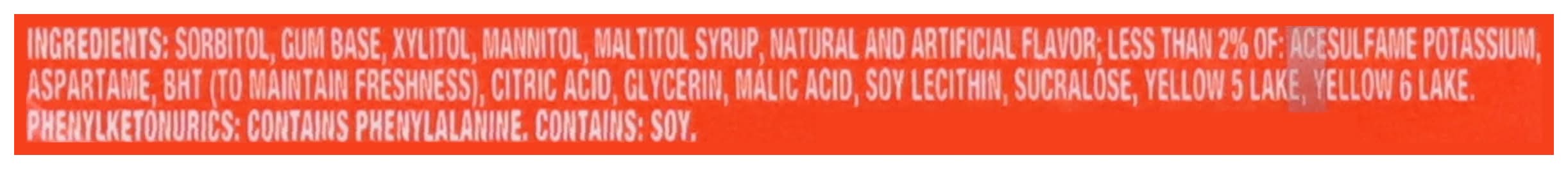 Ingredients: Sorbitol, Gum Base, Xylitol, Mannitol, Maltitol Syrup, Natural and Artificial Flavor; Less than 2% of: Acesulfame Potassium, Aspartame, BHT (to Maintain Freshness), Citric Acid, Glycerin, Malic Acid, Soy Lecithin, Sucralose, Yellow 5 Lake, Yellow 6 Lake Contains: Soybeans