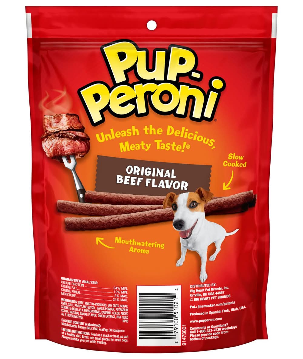 With real beef flavor and a mouthwatering aroma it's no wonder dogs simply can't resist Pup-Peroni® Original Beef Flavor dog snacks. Don't forget to take a package along so you can treat your Pup wherever you pal around! Soft and chewy dog treats with a mouthwatering aroma dogs love. Tender Jerky is easy to break into small pieces Unleash the delicious, meaty taste. Real beef is the number one ingredient Pup-Peroni soft dog treats are always made with real beef and have a mouthwatering aroma dogs can't resist Big Heart Pet Brands, Inc., San Francisco, CA, 94111