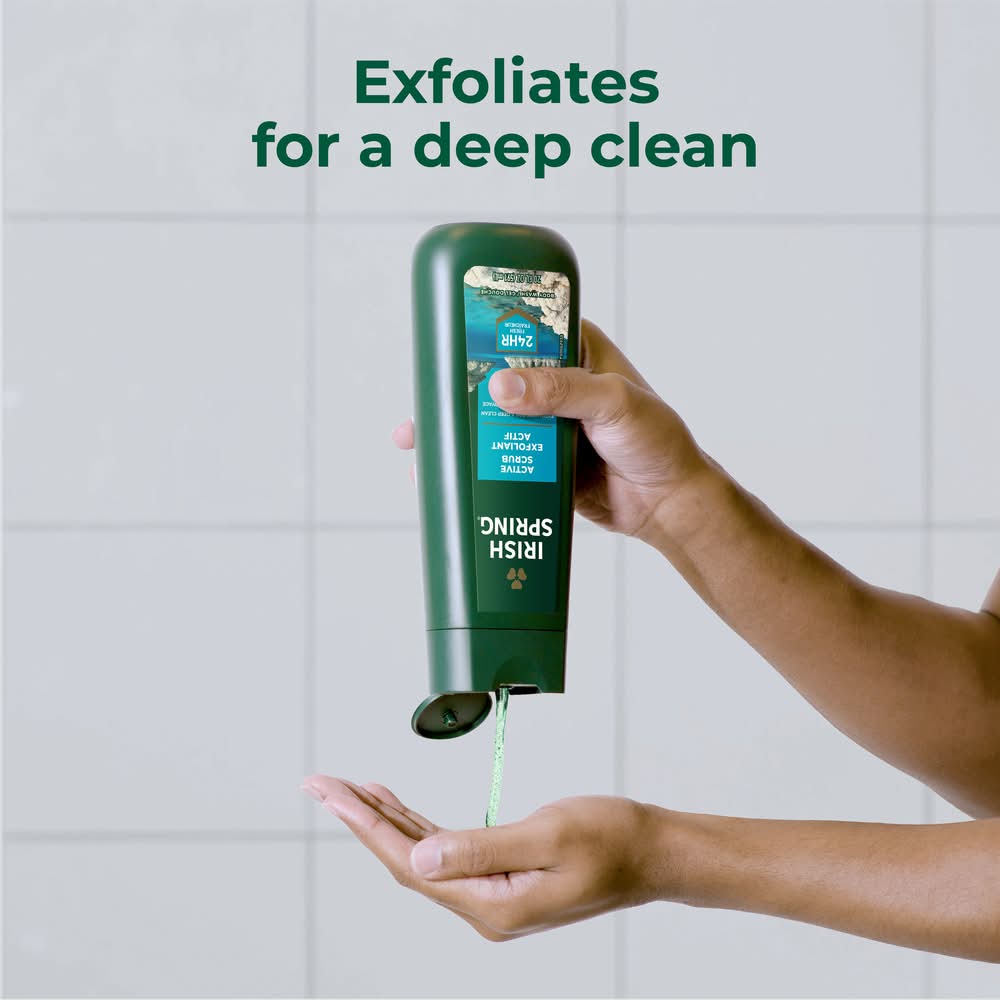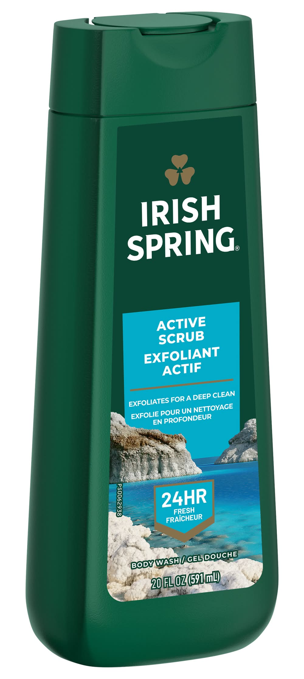 Irish Spring Active Scrub Body Wash, 20 Oz Smell like you came from a nice-smelling place with Irish Spring Body Wash. Count on Irish Spring Active Scrub Body Wash to leave your skin feeling clean — our Active Scrub exfoliating body wash for men retains skin’s natural moisture while keeping you fresh for 24 hours. Keep the good smells going with Irish Spring body wash. Fresh Look, Great Smell Feel clean, smell serene with the new Irish Spring. Our bottle might have a refreshed design, but it’s still the same great body wash you love. Our packaging refresh is all part of our master plan to bring the amazing places you love to smell straight to your bathroom. Plus, the larger size bottle of body wash for men gives you more time in a nice smelling place and you don't have to replace it as often. Get as fresh as the great outdoors and add some adventure to your everyday with the whole Spring of bar soaps and body washes for men. We want you to smell as great as you feel, so you can focus on moments that turn into memories. Body Wash for Body, Hands and Face Irish Spring Active Scrub Body Wash has a sudsy lather that washes away bacteria, so you can use it as a face wash or hand soap and keep the fresh smell going all day long. Made with biodegradable cleansing ingredients, this men’s body wash is paraben free and formulated without phthalates. Feel good while washing from head-to-toe with Irish Spring. • Colgate-palmolive company, New York, NY, 10022 • Packaging: Reusable