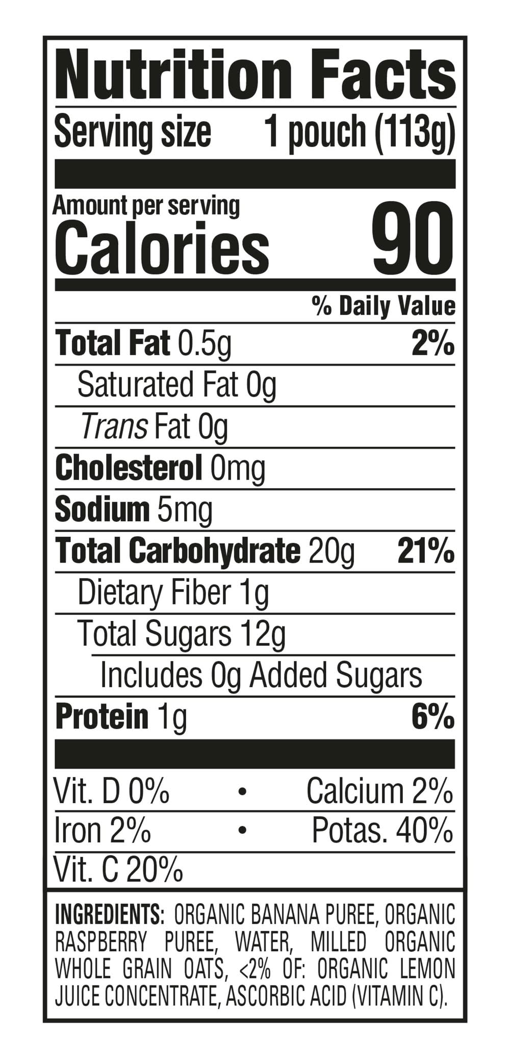 Ingredients: Organic Banana Puree, Organic Raspberry Puree, Water, Milled Organic Whole Grain Oats, <2% of: Ascorbic Acid (Vitamin C), Organic Lemon Juice Concentrate.