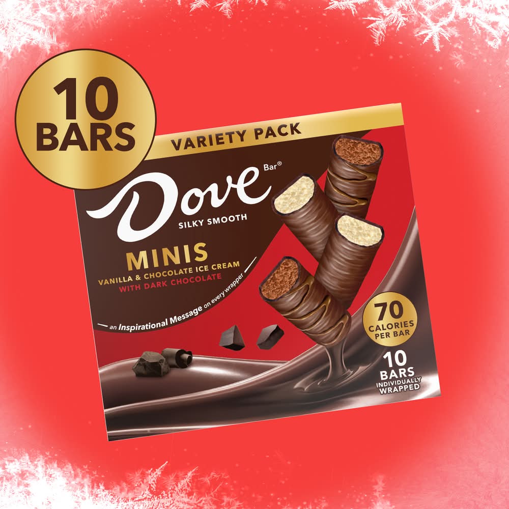 Every day is filled with competing demands! Step into a moment of pause with the decadence of the premium Dove Dark Chocolate Coated Mini Ice Cream Bar Assortment. After a long day, let the choice between creamy vanilla ice cream or rich chocolate ice cream be a mini win to put a smile on your face. Not only are these mini ice cream bars covered in thick and smooth Dove dark chocolate, but these guilt-free treats are only 70 calories each! Each variety box contains 10 individually wrapped bite-sized ice cream bars, ideal for an indulgent self-care treat for yourself. Enjoy as an afternoon treat while reading a book to sharing with friends as small rewards, our premium ice cream bars will elevate your relaxation time! Find joy in the smallest moments! Add Dove Vanilla and Chocolate Coated Mini Ice Cream Bars to your cart today. Contains one (1) 10-piece box of assorted Dove Vanilla and Chocolate Mini Dark Chocolate Coated Ice Cream Bars Bar Variety Pack Assortment Coated in thick, premium Dove dark chocolate, Dove Ice Cream treats are something special and guilt-free, with only 70 calories per bar From reading a book to scrolling the web, Dove Mini Ice Cream Bars are a bite-sized, high-quality novelty treat that can help you unwind for quality me-time Like beloved Dove Promises, look forward to inspiring messages on every wrapper A freezer stocked with Dove Mini Ice Cream Bars makes sharing with family and friends easy Flavor: Vanilla-chocolate