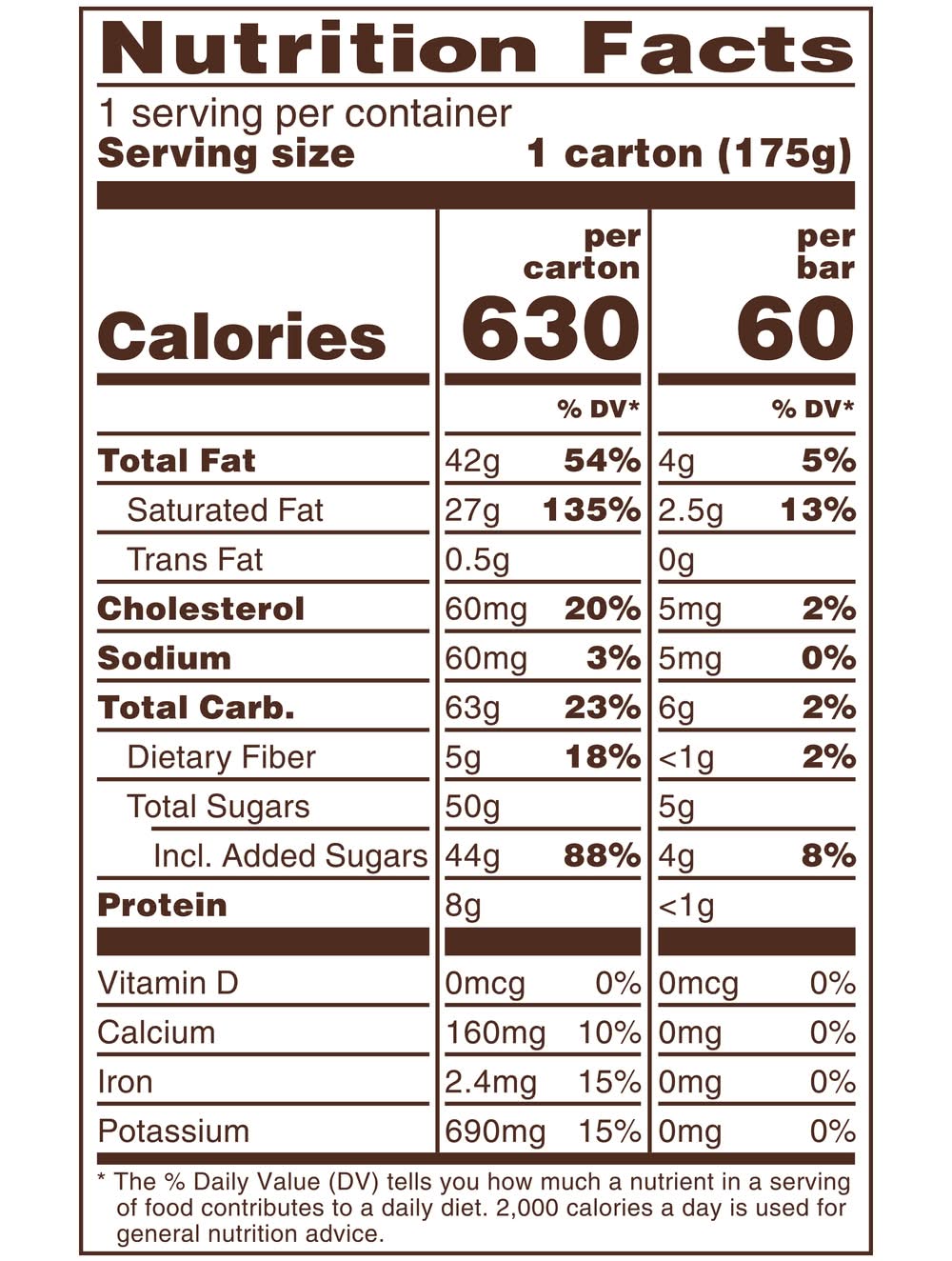 Ingredients: SKIM MILK, SUGAR, CREAM, CHOCOLATE, CHOCOLATE PROCESSED WITH ALKALI, CORN SYRUP, COCONUT OIL; LESS THAN 2% OF: PALM OIL, COCOA BUTTER, COCOA POWDER PROCESSED WITH ALKALI, MILKFAT, SOY LECITHIN, MONO AND DIGLYCERIDES, CAROB BEAN GUM, VANILLA EXTRACT, GUAR GUM, LACTOSE, CARRAGEENAN, NATURAL FLAVOR, BETA CAROTENE (COLOR). Contains: CONTAINS MILK AND SOY.\nMAY CONTAIN PEANUTS, TREE NUTS AND WHEAT.