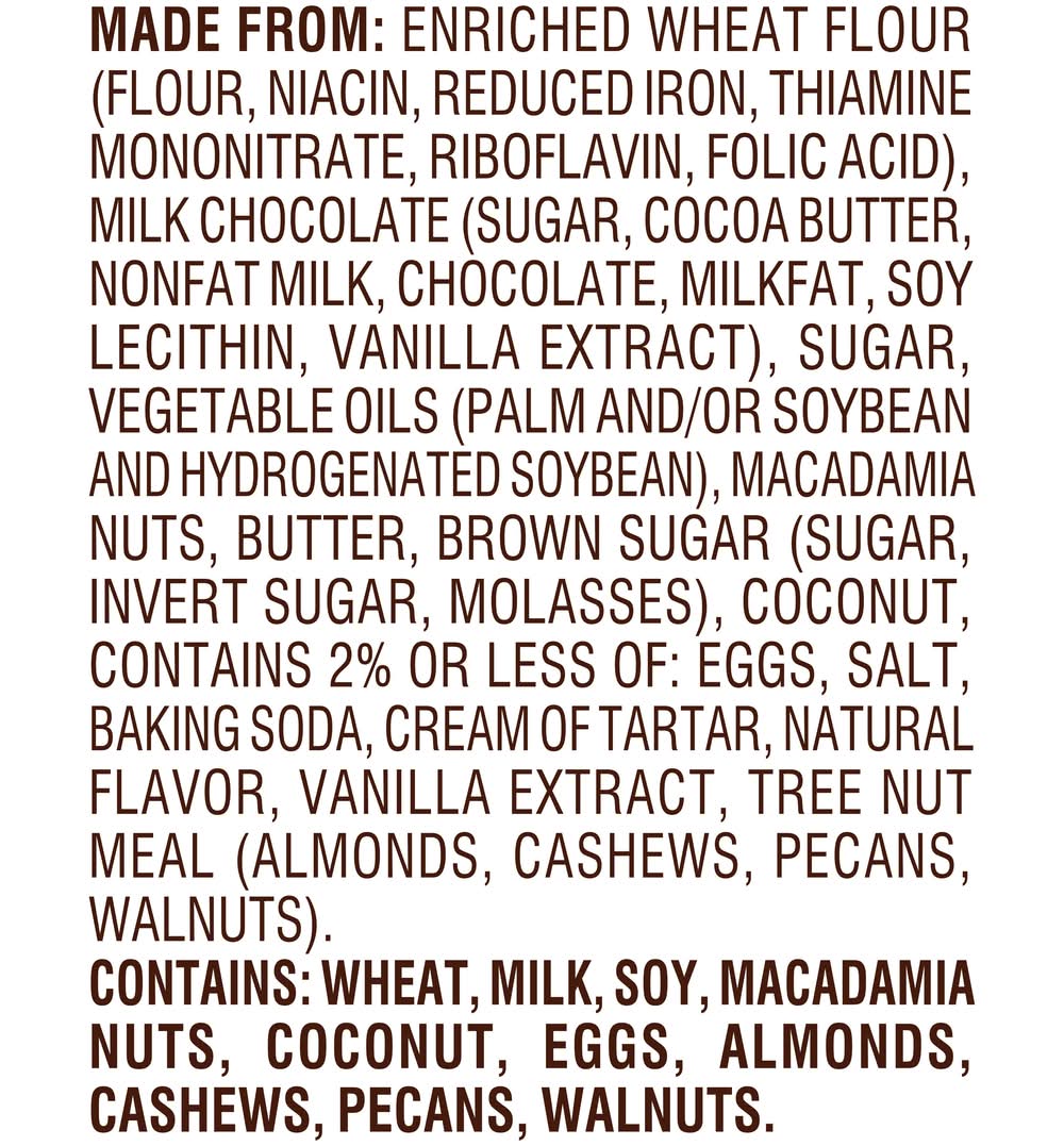 Ingredients: MADE FROM: ENRICHED WHEAT FLOUR (FLOUR, NIACIN, REDUCED IRON, THIAMINE MONONITRATE, RIBOFLAVIN, FOLIC ACID), MILK CHOCOLATE (SUGAR, COCOA BUTTER, NONFAT MILK, CHOCOLATE, MILKFAT, SOY LECITHIN, VANILLA EXTRACT), SUGAR, VEGETABLE OILS (PALM AND/OR SOYBEAN AND HYDROGENATED SOYBEAN), MACADAMIA NUTS, BUTTER, BROWN SUGAR (SUGAR, INVERT SUGAR, MOLASSES), COCONUT, CONTAINS 2% OR LESS OF: EGGS, SALT, BAKING SODA, CREAM OF TARTAR, NATURAL FLAVOR, VANILLA EXTRACT, TREE NUT MEAL (ALMONDS, CASHEWS, PECANS, WALNUTS), . CONTAINS: WHEAT, MILK, SOY, MACADAMIA NUTS, COCONUT, EGGS, ALMONDS, CASHEWS, PECANS, WALNUTS. Contains: CONTAINS: Egg, Gluten, Milk/Dairy, Nut, Soybean, Wheat