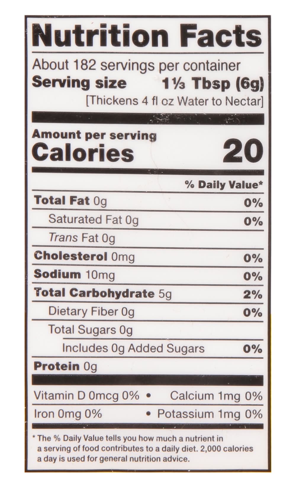 Is a dietary supplement designed for individuals with dysphagia. It is gluten-free and Kosher Pareve certified. Since 1987, it has been recognized for its nutrition innovation. The product is flavorless and designed to thicken hot or cold beverages and pureed foods without altering their flavor. The thickener is fast-mixing, yields consistent results, and is easy to use. It is also easily digestible. The contents are sold by weight, and some settling may occur during shipping. It is suitable for a diabetic exchange equivalent to 1/3 fruit. • Number of servings: 182 • Kent Precision Foods Group, Inc., Muscatine, IA, 52761
