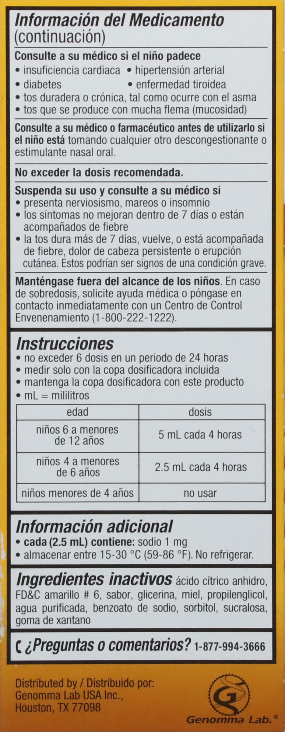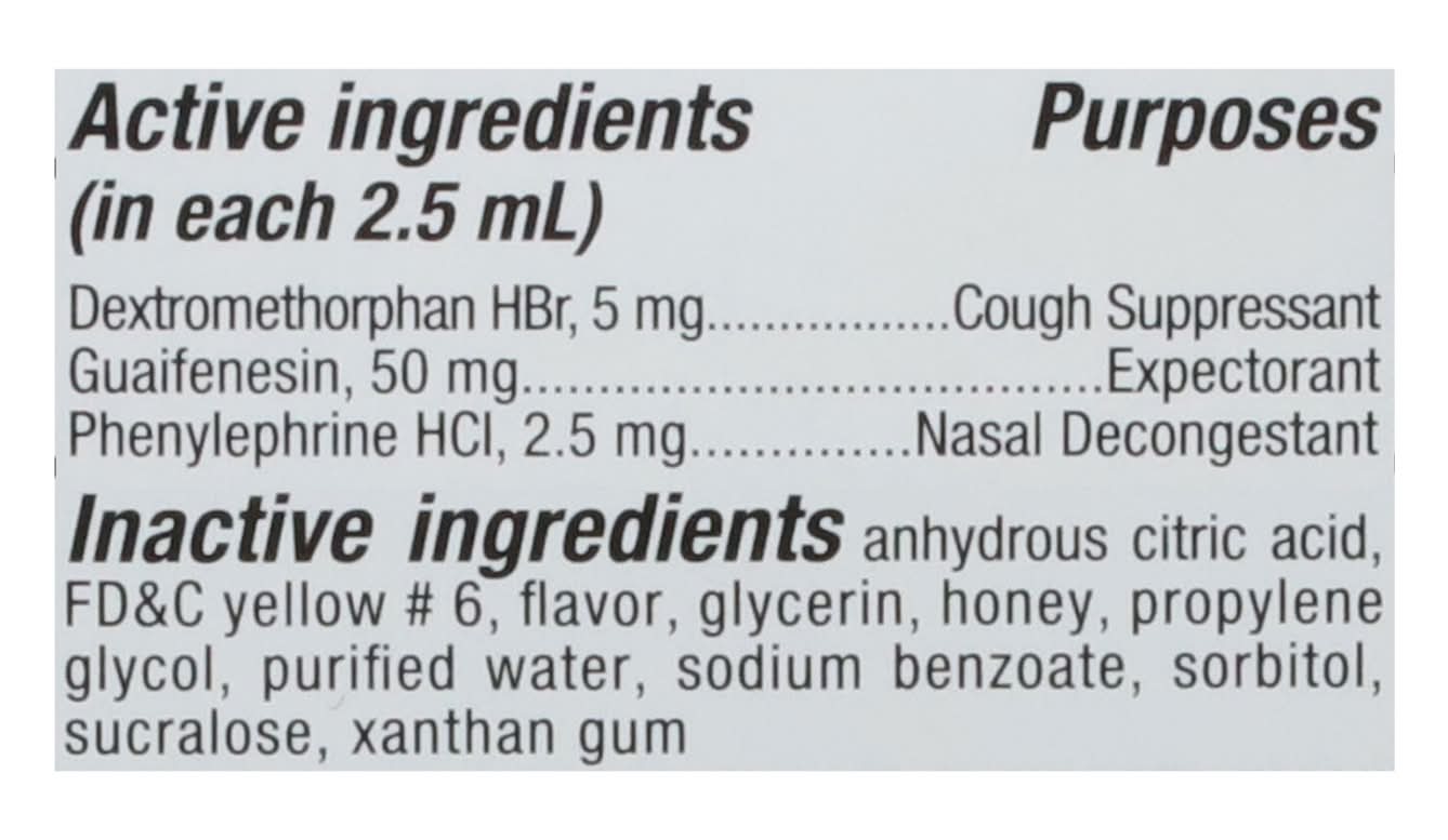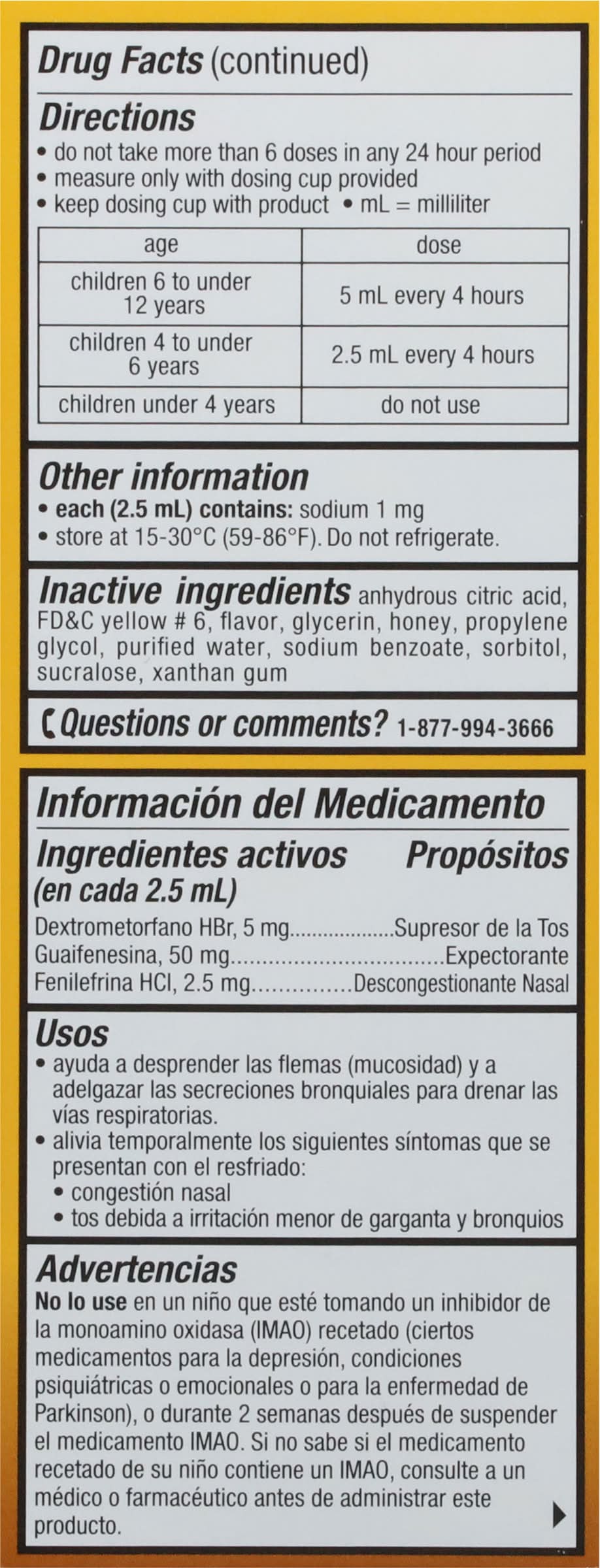 Ingredients: In Each 5 mL: Active Ingredients: Dextromethorphan HBr (5 mg), Cough Suppressant.; Guaifenesin (50 mg), Expectorant.; Phenylephrine HCI (2.5 mg), Nasal Decongestant. Inactive Ingredients: Anhydrous Citric Acid, FD&C Yellow 6, Flavor, Glycerin, Honey, Propylene Glycol, Purified Water, Sodium Benzoate, Sorbitol, Sucralose, Xanthan Gum