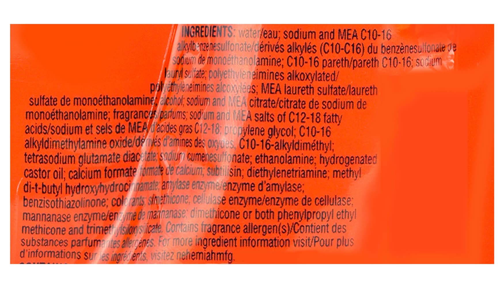 Ingredients: Sodium and MEA C10-16 Alkylbenzenesulfonate; C10-16 Pareth; Sodium Lauryl Sulfate; MEA Laureth Sulfate; C10-16 Alkyldimethylamine Oxide; C10-16-Alkyldimethyl; Sodium Borate; Sodium Cumenesulfonate, Hydrogenated Castor Oil; Calcium Formate; Phenylpropyl Ethyl Methicone; Sodium and MEA Salts of C12-18 Fatty Acids; Simethicone; Trimethylsiloxysilicate; Sodium and MEA Citrate; Subtilisin; Amylase Enzyme; Mannanase Enzyme; Polyethyleneimines Alkoxylated; Tetrasodium Glutamate Diacetate; Fluorescent Brightener 71; Diethylenetriamine, Methyl Di-t-Butyl Hydroxyhydrocinnamate; Alcohol; Propylene Glycol; Ethanolamine; Colorants; Fragrances; Water