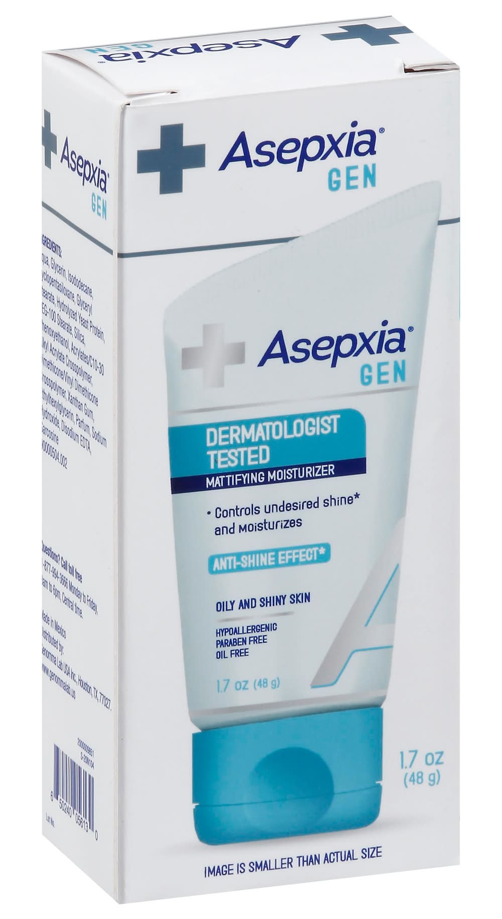 Dermatologist tested. Controls undesired shine (Results using the complete Asepxia GEN line) and moisturizes. Anti-shine effect (Results using the complete Asepxia GEN line). Oily and shiny skin. Hypoallergenic. Paraben free. Oil free. Image is smaller than actual size. Its formula hydrates, helping to preserve the skin's natural defense barrier and to control excess oil and unwanted shine. It does not dry out or irritate. Leaves skin feeling soft, hydrated and mattified immediately. www.genommalab.us. Questions? Call toll free 1-877-994-3666 Monday to Friday, 8 am to 6 pm, Central time. Made in Mexico.