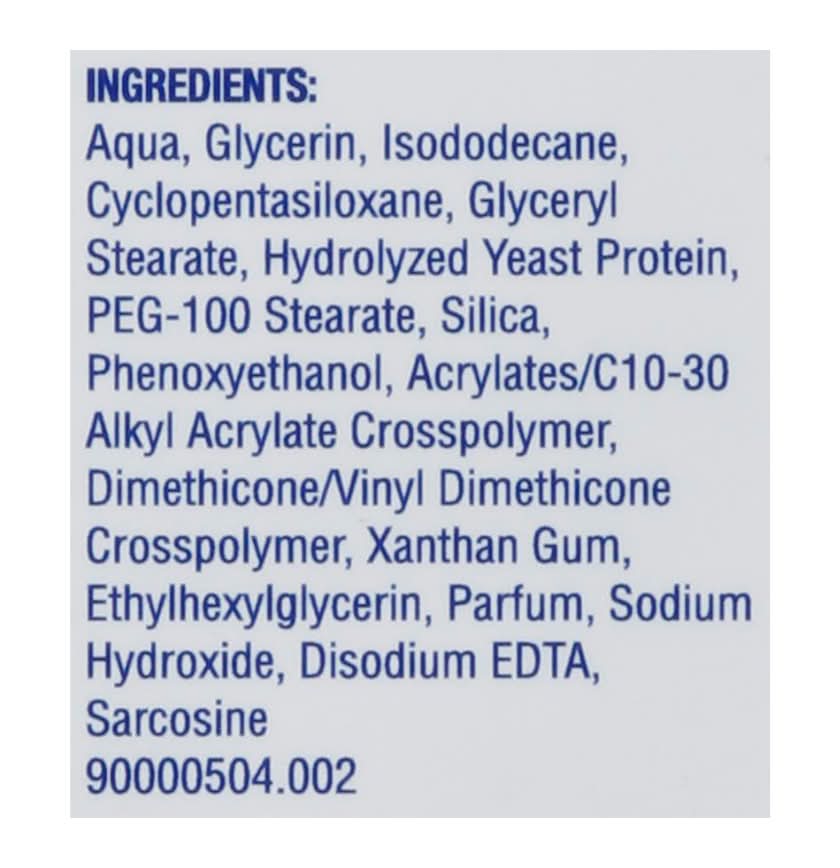 Ingredients: Aqua, Glycerin, Isododecane, Cyclopentasiloxane, Glyceryl Stearate, Hydrolyzed Yeast Protein, PEG-100 Stearate, Silica, Phenoxyethanol, Acrylates/C10-30 Alkyl Acrylate Crosspolymer, Dimethicone/Vinyl Dimethicone Crosspolymer, Xanthan Gum, Ethylhexylglycerin, Parfum, Sodium Hydroxide, Disodium EDTA, Sarcosine