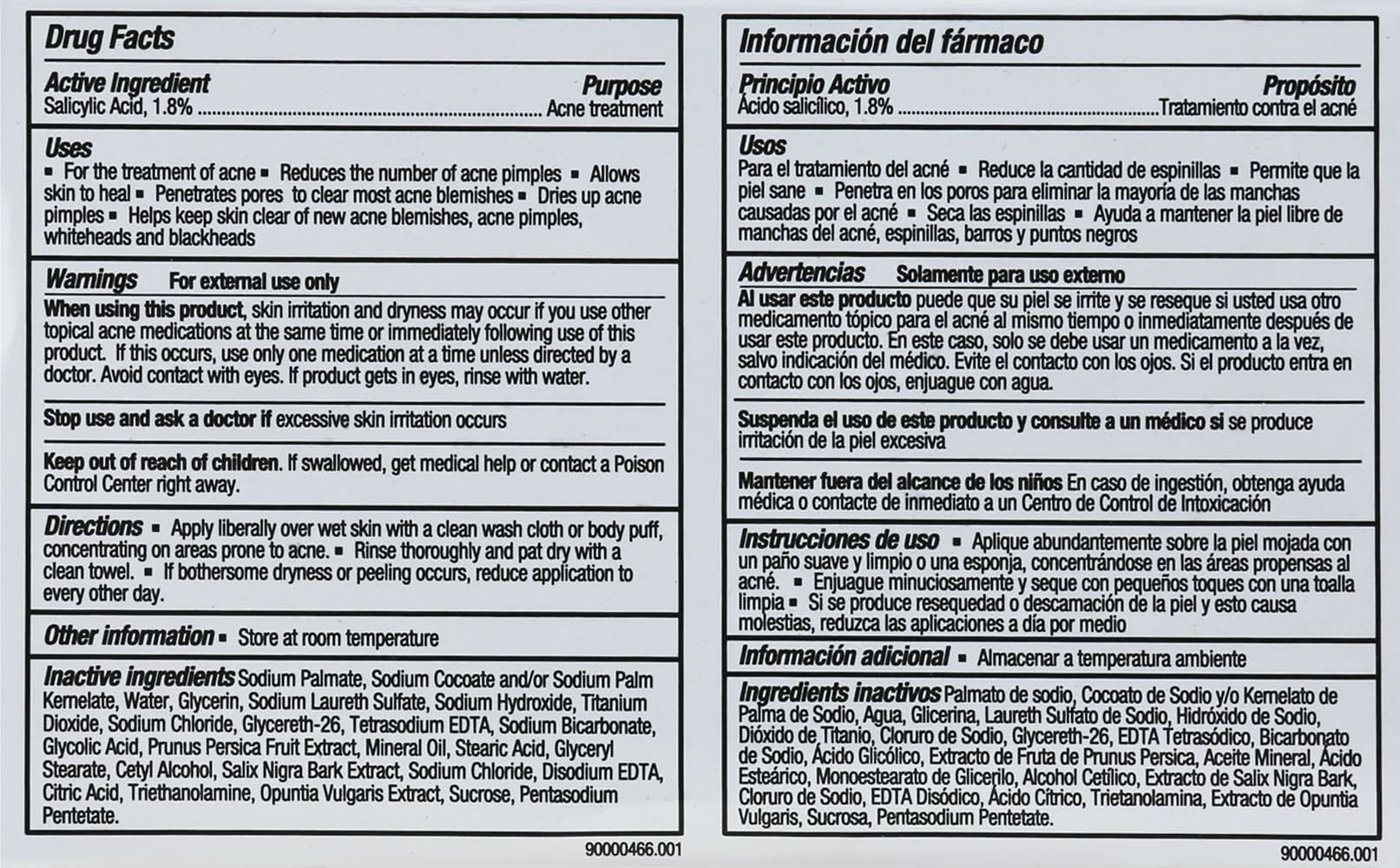 Ingredients: Active Ingredients: Salicylic Acid (1.8 %), Acne Treatment. Inactive Ingredients: Sodium Palmate, Sodium Cocoate and/or Sodium Palm Kernelate, Water, Glycerin, Sodium Laureth Sulfate, Sodium Hydroxide, Titanium Dioxide, Sodium Chloride, Glycereth-26, Tetrasodium EDTA, Sodium Bicarbonate, Glycolic Acid, Prunus Persica Fruit Extract, Mineral Oil, Stearic Acid, Glyceryl Stearate, Cetyl Alcohol, Salix Nigra Bark Extract, Sodium Chloride, Disodium EDTA, Citric Acid, Triethanolamine, Opuntia Vulgaris Extract, Sucrose, Pentasodium Pentetate