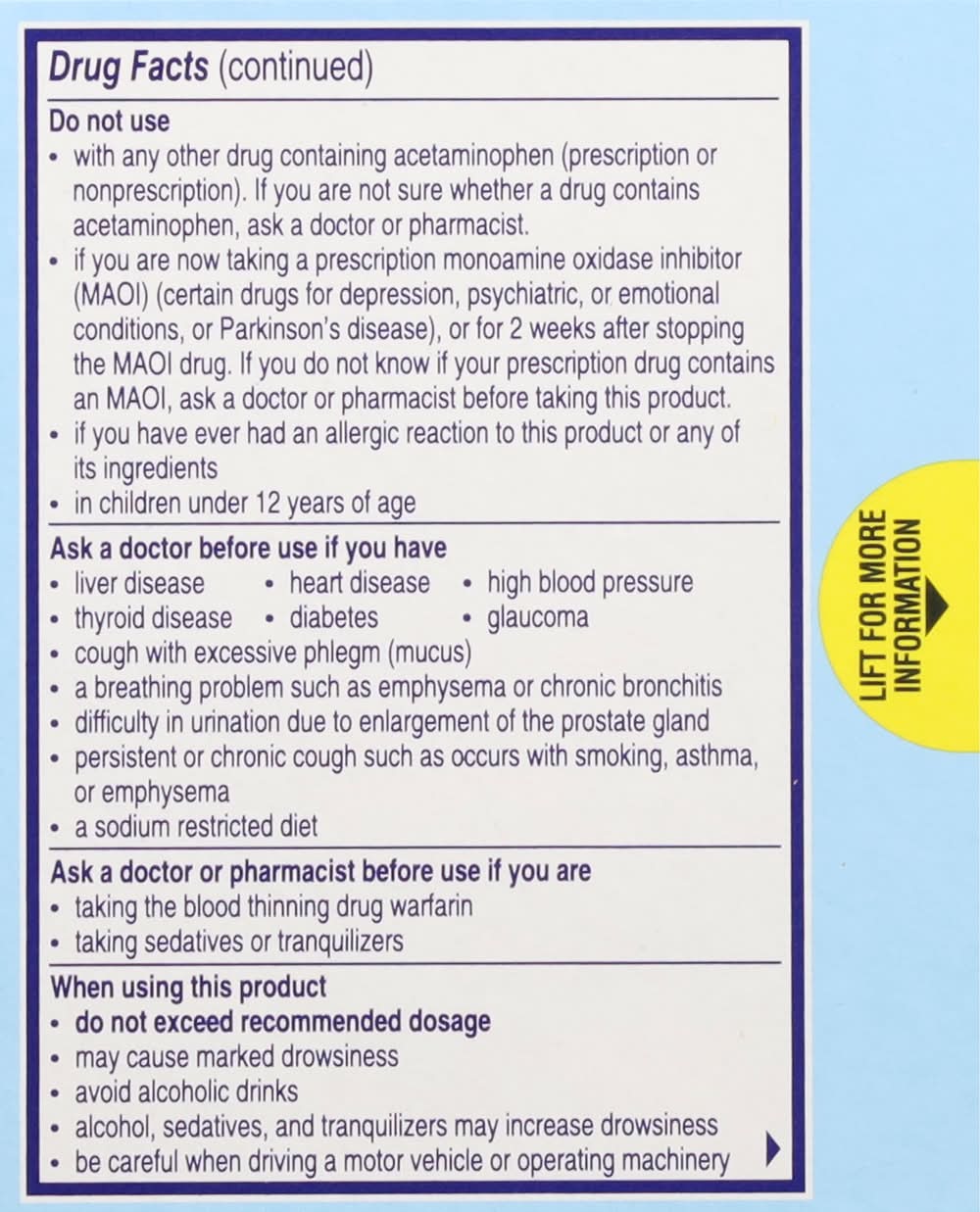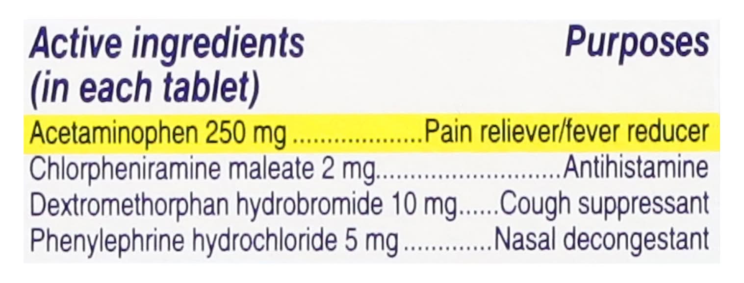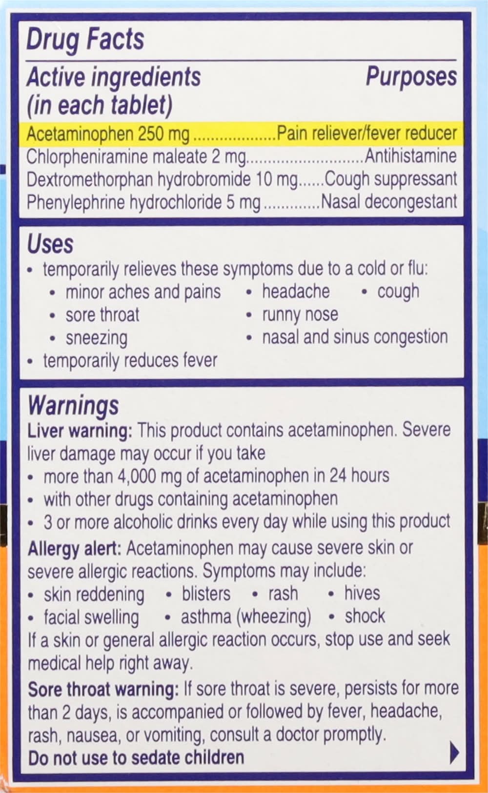 Ingredients: In Each Tablet: Active Ingredients: Acetaminophen (250 mg), Pain Reliever/Fever Reducer; Chlorpheniramine Maleate (2 mg), Antihistamine; Dextromethorphan Hydrobromide (10 mg), Cough Suppressant; Phenylephrine Hydrochloride (5 mg), Nasal Decongestant. Inactive Ingredients: Anhydrous Citric Acid, Calcium Silicate, Dimethicone, FD&C Red 40, FD&C Yellow 6, Flavors, Magnesium Stearate, Maltodextrin, Mannitol, Potassium Bicarbonate, Povidone, Sodium Bicarbonate, Sucralose