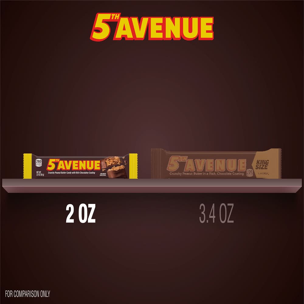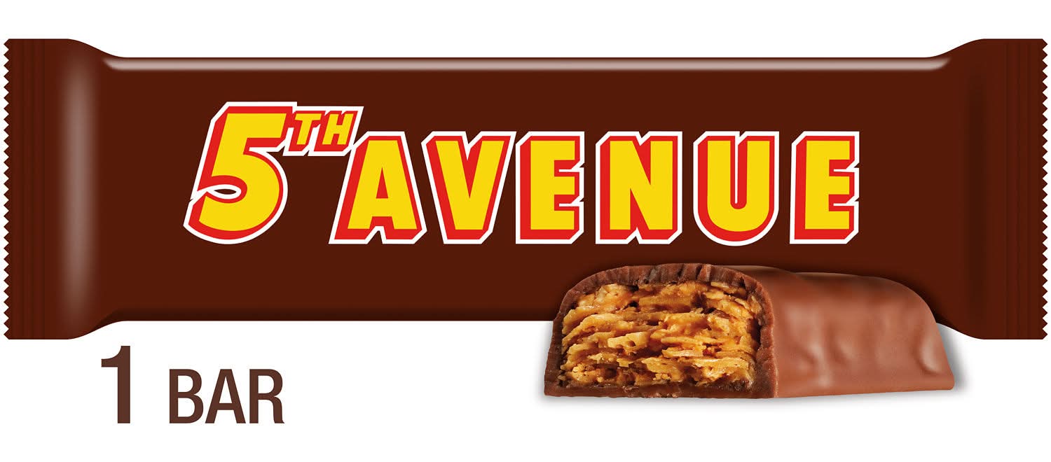 Packing a punch of rich chocolate coated peanut butter flavor since 1936, this 5TH AVENUE candy bar is a delicious treat that pays homage to the hustle and bustle of NYC. It's the ideal treat when you want a sweet and savory pick me up during the day. Plus, you can take these individually wrapped, kosher certified treats with you on your next adventure, whether you're on a hiking trip, packing school lunches or running errands, this candy bar makes the perfect snack. The taste profile of a 5TH AVENUE candy bar makes it a fun snack to munch on during your lunch break, movie night, annual celebration or as a midday treat and evening dessert. Each bite of a 5TH AVENUE candy bar is full of rich chocolate candy and crunchy peanut butter to fill your taste buds with loads of flavor. For anyone who loves to bake, add these peanut butter and rich chocolate candy bars to your cookie recipes, as a crumbled topping for your cake icing or as a base for your next dessert bar. 5TH AVENUE chocolate candies also make great gifts for the holidays. Stuff them in Christmas stockings, Easter baskets, Halloween candy bowls and Valentine's Day gift bags. Just don't forget to save one for yourself! • Number of servings: 1 • The Hershey Company, Hershey, PA, 17033-0815, Ph: 800-468-1714