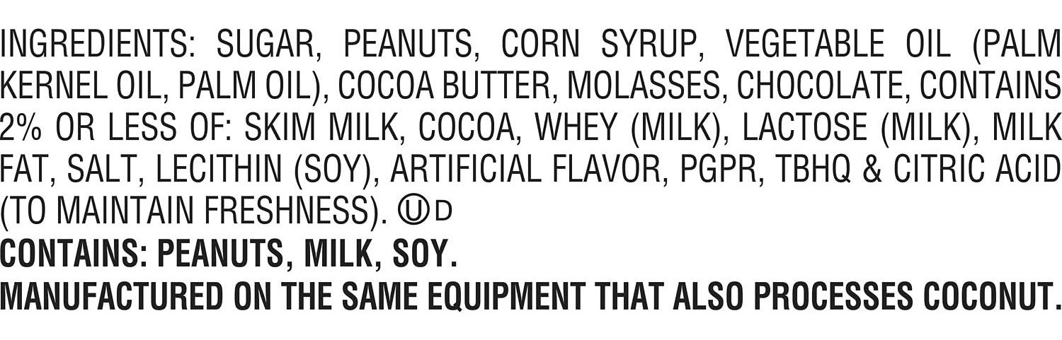 Ingredients: SUGAR, PEANUTS, CORN SYRUP, VEGETABLE OIL (PALM KERNEL OIL, PALM OIL), COCOA BUTTER, MOLASSES, CHOCOLATE, CONTAINS 2% OR LESS OF: SKIM MILK, COCOA, WHEY (MILK), LACTOSE (MILK), MILK FAT, SALT, LECITHIN (SOY), ARTIFICIAL FLAVOR, PGPR, TBHQ CITRIC ACID (TO MAINTAIN FRESHNESS), . Contains: Contains: Peanuts|Soy|Milk