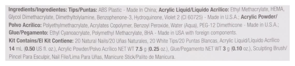 Ingredients: Tips: ABS Plastic. Acrylic Liquid: Ethyl Methacrylate, Hema, Glycol Dimethacrylate, Dimethyltolylamine, Benzophenone-3, Hydroquinone, Violet 2 (CI 60725). Acrylic Powder: Polyethylmethacrylate, Acrylates Copolymer, Benzoyl Peroxide, Water (Aqua), PEG-12 Dimethicone. Glue: Ethyl Cyanoacrylate, Polymethyl Methacrylate, BHA