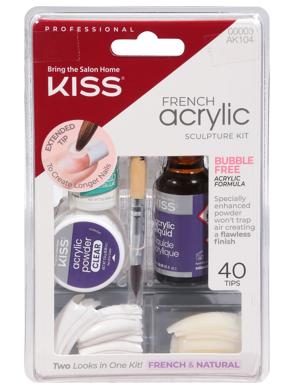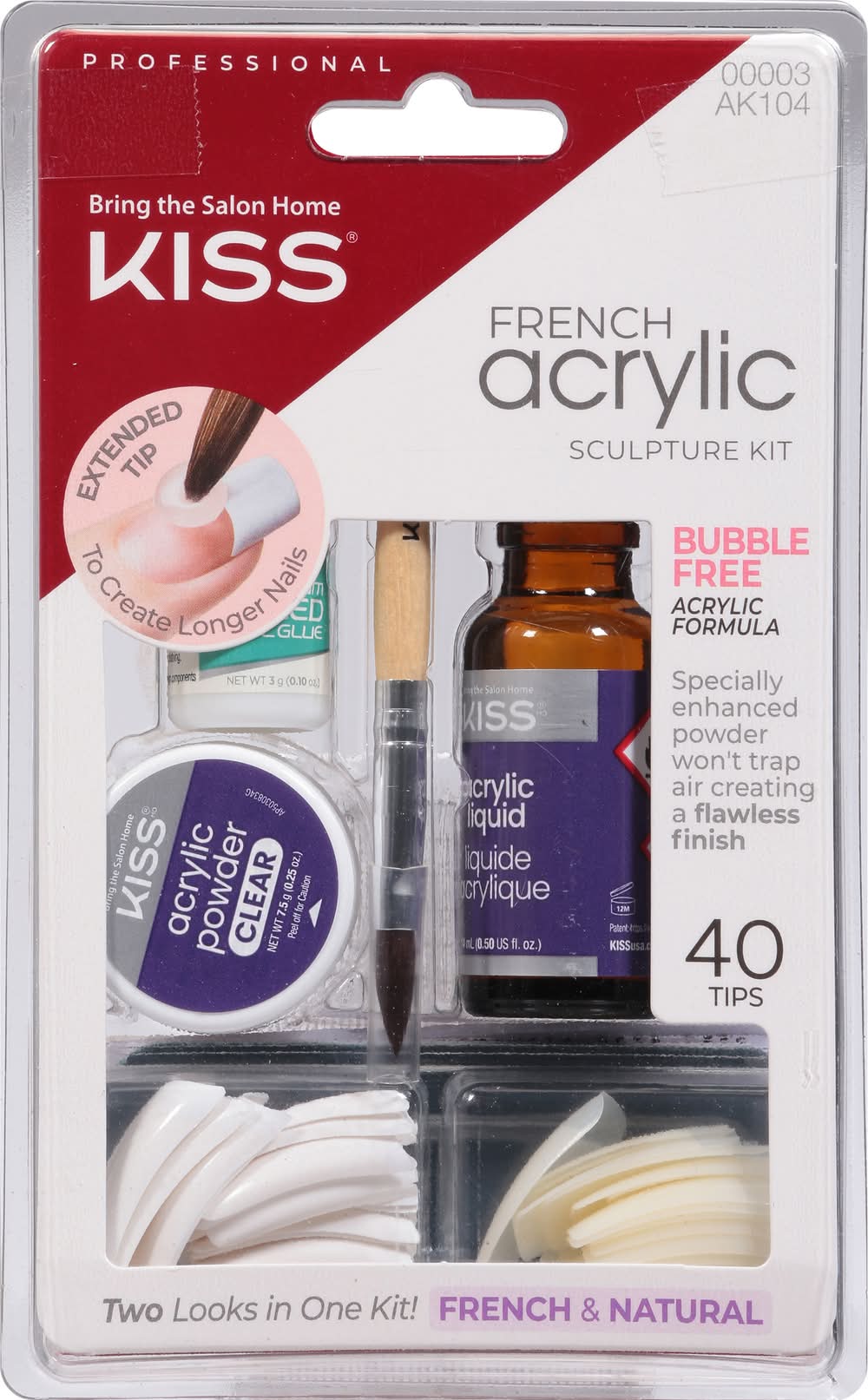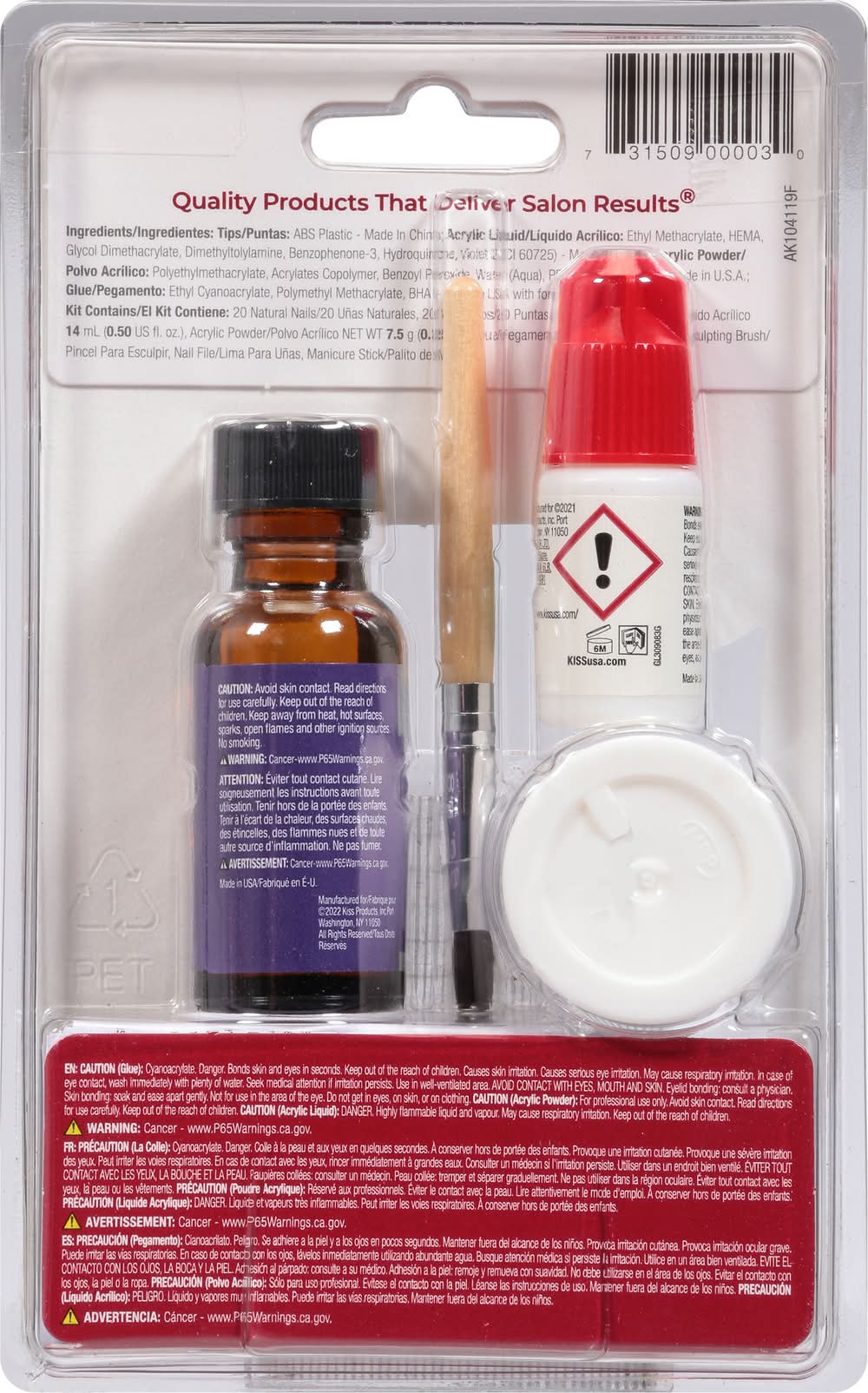Kit Contains: 20 natural nails; 20 white tips; acrylic liquid: 14 ml (0.50 US fl oz); acrylic powder net wt 7.5 g (0.25 oz); glue net wt 3 g (0.10 oz); sculpting brush; nail file; manicure stick. Professional. Bring the salon home. Extended tip. To create longer nails. Blue bubble free acrylic formula. Specially enhanced powder won't trap air creating a flawless finish. Two looks on one kit! French & natural. Quality products that delivers salon results. Kit Contains: 20 natural nails, 20 white tips, acrylic liquid 14 ml (0.50 US fl. oz.), acrylic powder net wt 7.5 g (0.25 oz.), glue net wt 3 g (0.10 oz.), sculpting brush, nail file, manicure stick.