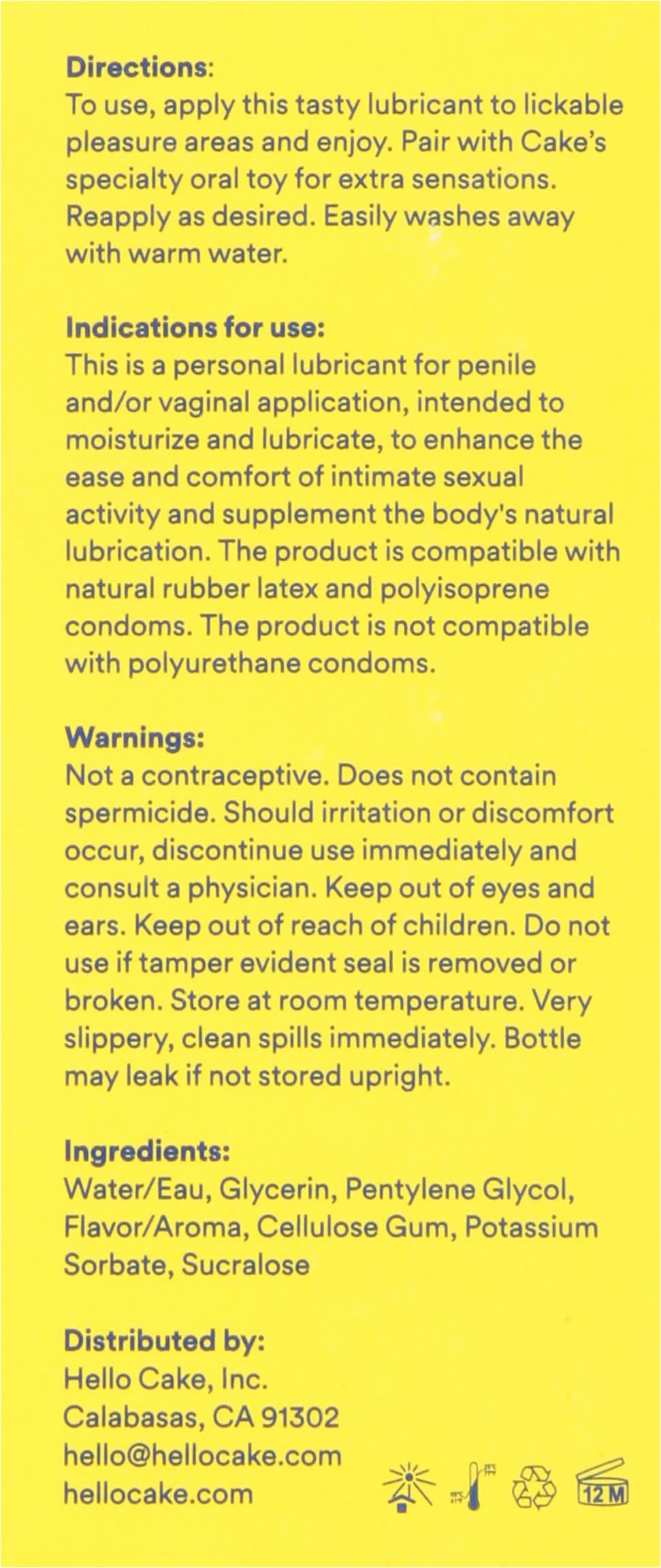 Directions for use: Usage of instructions:Directions: To use, apply this tasty lubricant to lickable pleasure areas and enjoy. Pair with Cake's specialty oral toy for extra sensations. Reapply as desired. Easily washes away with warm water. Indications for use: This is a personal lubricant for penile and/or vaginal application, intended to moisturize and lubricate, to enhance the ease and comfort of intimate sexual. Activity and supplement the body's natural lubrication. The product is compatible with natural rubber latex and polyisoprene condoms. The product is not compatible with polyurethane condoms. - Directions: To use, apply this tasty lubricant to lickable pleasure areas and enjoy. Pair with Cake's specialty oral toy for extra sensations. Reapply as desired. Easily washes away with warm water. Indications for use: This is a personal lubricant for penile and/or vaginal application, intended to moisturize and lubricate, to enhance the ease and comfort of intimate sexual. Activity and supplement the body's natural lubrication. The product is compatible with natural rubber latex and polyisoprene condoms. The product is not compatible with polyurethane condoms. Store at room temperature. Very slippery, clean spills immediately. Bottle may leak if not stored upright. Storage recommendation: Store at room temperature. Very slippery, clean spills immediately. Bottle may leak if not stored upright.