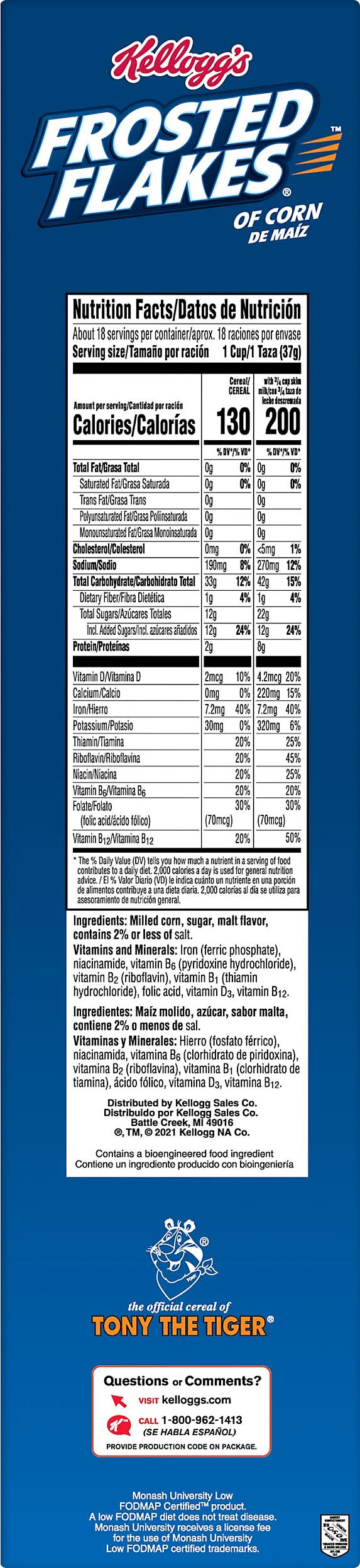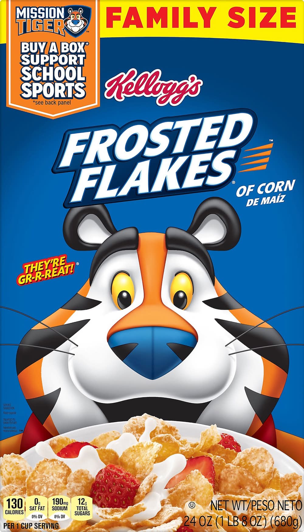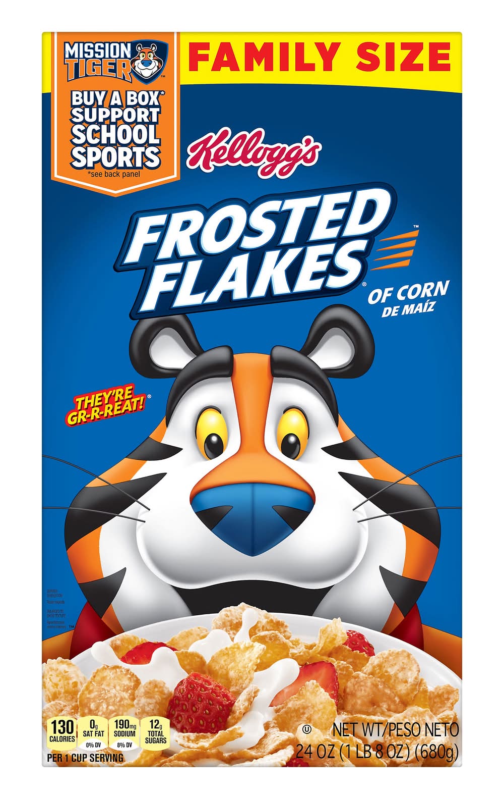 Just like Tony the Tiger, your whole family can get even their busiest days going with Kellogg's Frosted Flakes ready-to-eat breakfast cereal. Thanks to the toasty, crunchy corn flakes sprinkled with sweet frosting, adults and kids experience a tasty and satisfying bowl every time. Each serving of this cereal is fat free and a good source of 8 vitamins and minerals. Plus, there are no artificial colors or flavors; enjoy a bowl of Kellogg's Frosted Flakes with your favorite dairy or nut milk. Eat pawfuls as a snack or late-night bite. Make it a sweet complement to your morning coffee or tea. Crush them up as a crunchy topping for ice cream. Kellogg's Frosted Flakes cereal gives you the sweet spark to go all in and let your GR-R-REAT out. Start your morning right and enjoy the irresistible taste of crunchy corn flakes with a sparkle of sweet frosting in every spoonful Treat your family to GR-R-REAT-tasting, crunchy flakes of corn sprinkled with sweet frosting Perfect for both kids and adults Healthy, fat-free cereal A good source of 8 vitamins and minerals in every serving Kosher Pareve Enjoy with your favorite milk or as a tasty snack at work, after school, or late night bite Includes 1, 24-ounce box of Frosted Flakes ready-to-eat cereal Packaged for freshness and great taste • Kellogg Sales Co, Battle Creek,49016,MI,USA • Packaging: Reusable