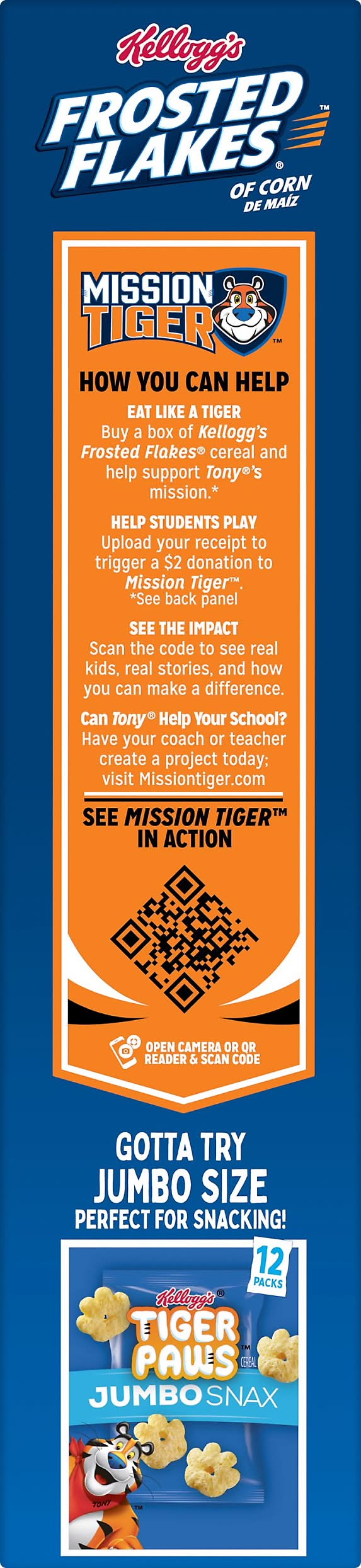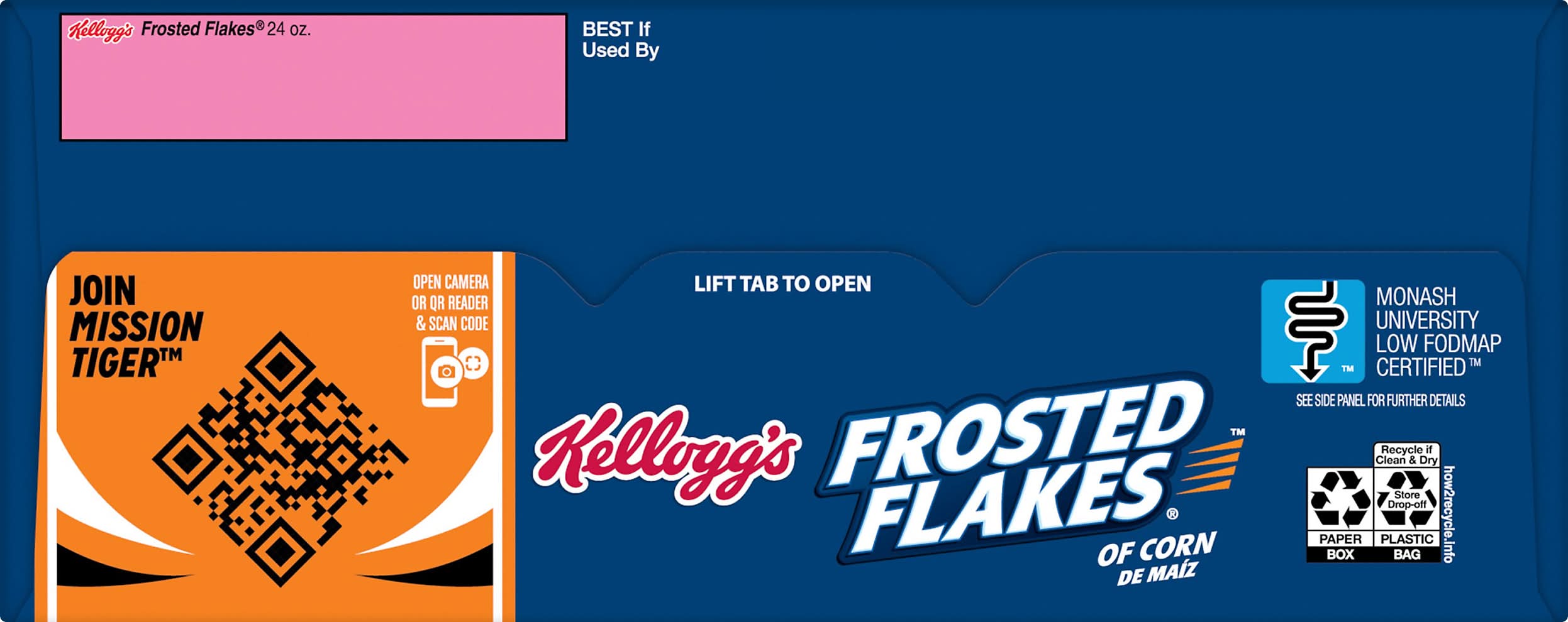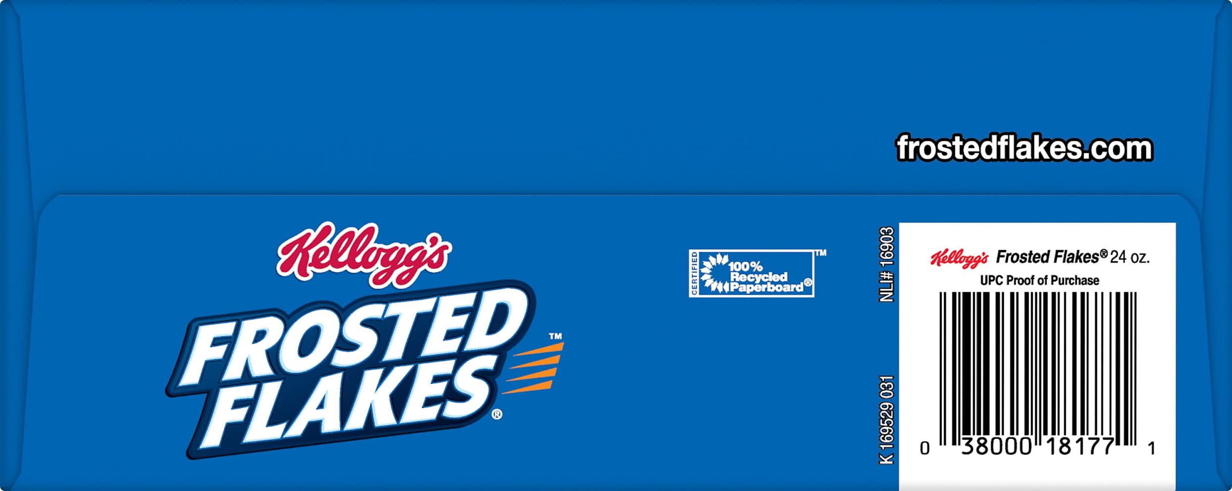 Just like Tony the Tiger, your whole family can get even their busiest days going with Kellogg's Frosted Flakes ready-to-eat breakfast cereal. Thanks to the toasty, crunchy corn flakes sprinkled with sweet frosting, adults and kids experience a tasty and satisfying bowl every time. Each serving of this cereal is fat free and a good source of 8 vitamins and minerals. Plus, there are no artificial colors or flavors; enjoy a bowl of Kellogg's Frosted Flakes with your favorite dairy or nut milk. Eat pawfuls as a snack or late-night bite. Make it a sweet complement to your morning coffee or tea. Crush them up as a crunchy topping for ice cream. Kellogg's Frosted Flakes cereal gives you the sweet spark to go all in and let your GR-R-REAT out. Start your morning right and enjoy the irresistible taste of crunchy corn flakes with a sparkle of sweet frosting in every spoonful Treat your family to GR-R-REAT-tasting, crunchy flakes of corn sprinkled with sweet frosting Perfect for both kids and adults Healthy, fat-free cereal A good source of 8 vitamins and minerals in every serving Kosher Pareve Enjoy with your favorite milk or as a tasty snack at work, after school, or late night bite Includes 1, 24-ounce box of Frosted Flakes ready-to-eat cereal Packaged for freshness and great taste • Kellogg Sales Co, Battle Creek,49016,MI,USA • Packaging: Reusable