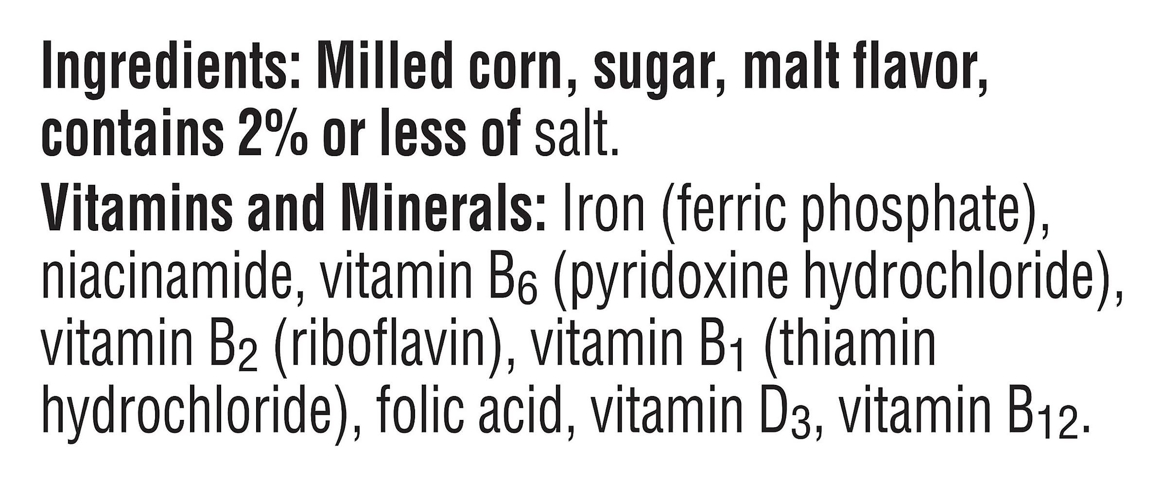 Ingredients: Milled Corn, Sugar, Malt Flavor, Contains 2% or Less of Salt. Vitamins and Minerals: Iron (Ferric Phosphate), Niacinamide, Vitamin B6 (Pyridoxine Hydrochloride), Vitamin B2 (Riboflavin), Vitamin B1 (Thiamin Hydrochloride), Folic Acid, Vitamin D3, Vitamin B12