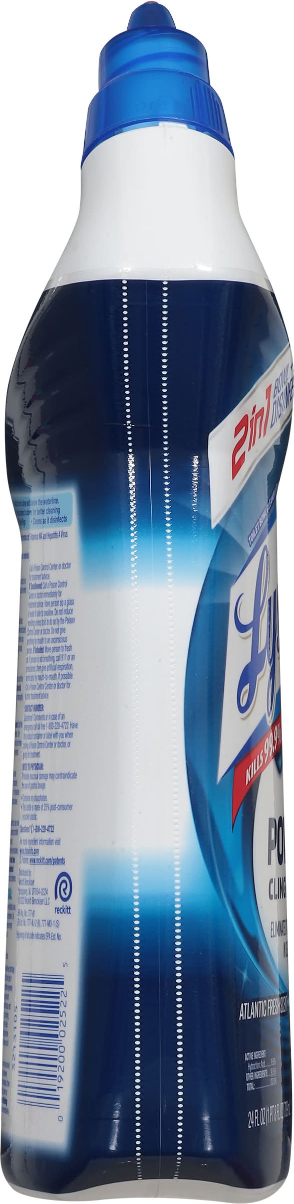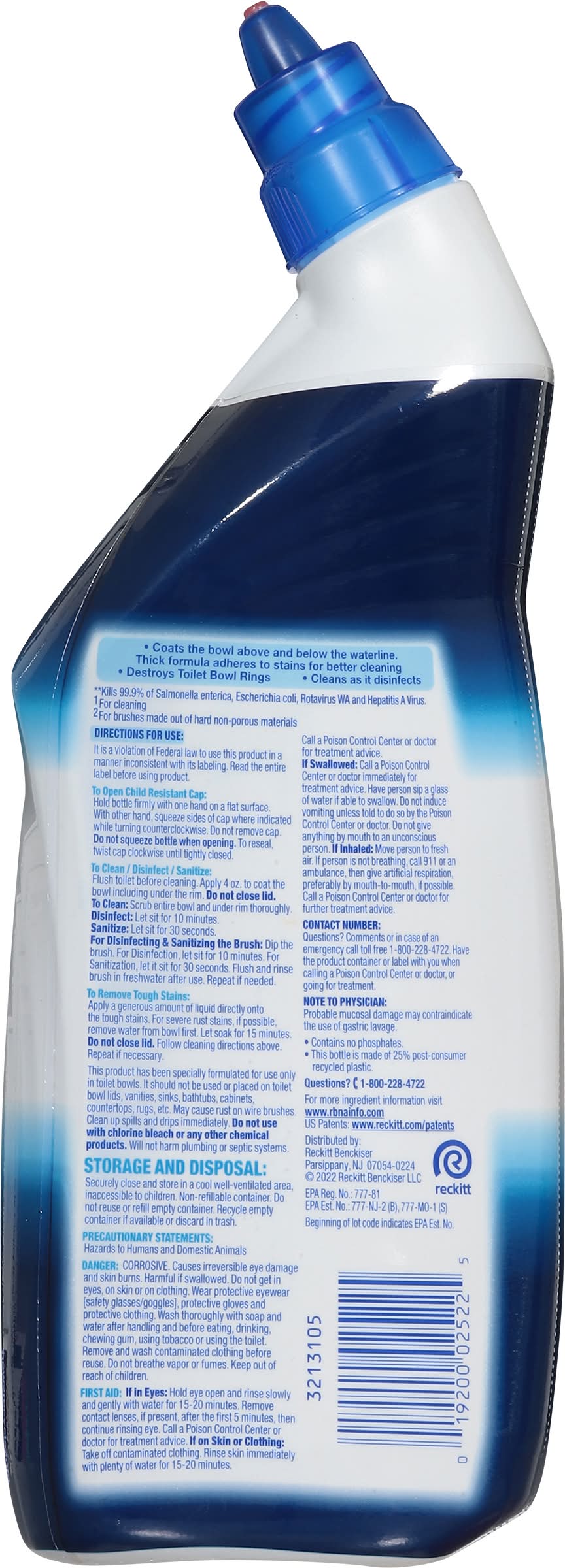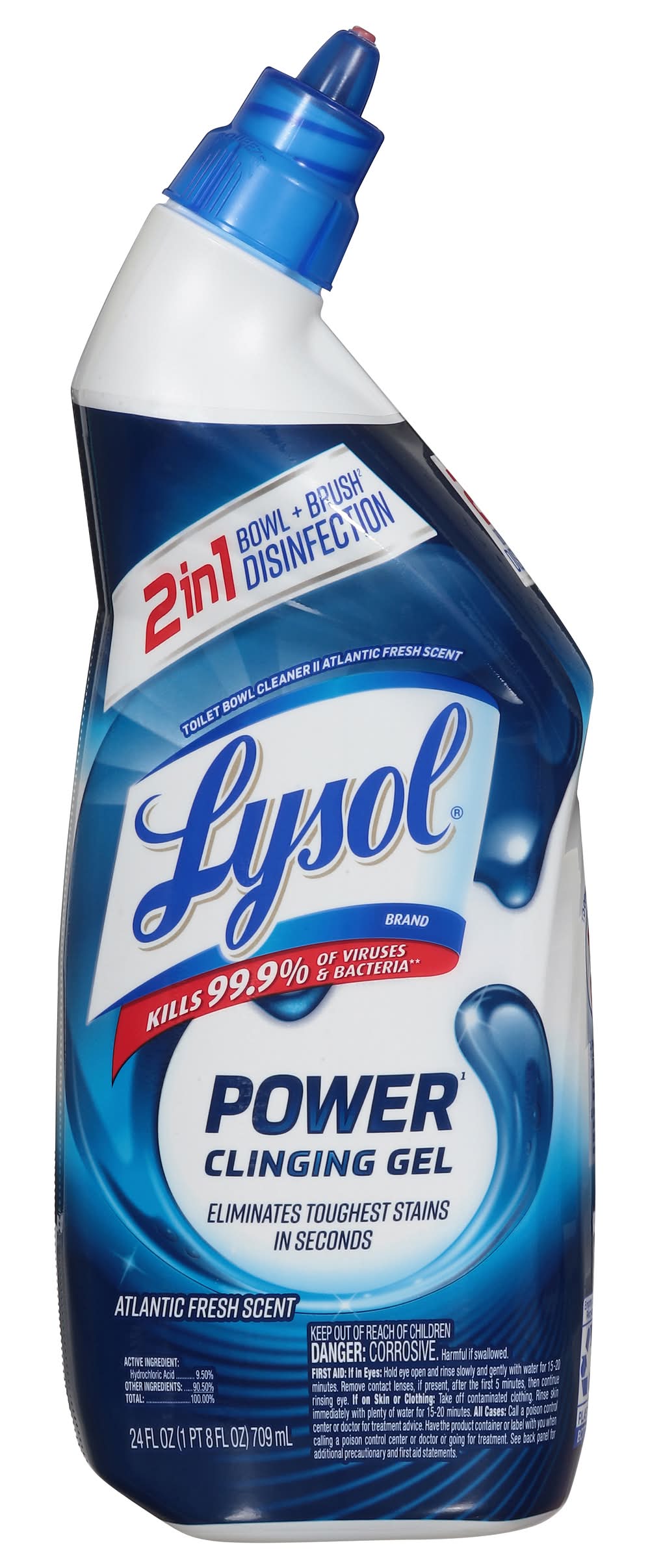 Lysol Toilet Bowl Cleaner cleans and disinfects toilets. The thick formula sticks to the bowl for better cleaning. Lysol liquid toilet bowl cleaner kills 99.9% of viruses & bacteria with complete clean power. The angled bottle targets hard-to-reach areas, including under the rim, to leave your entire toilet bowl sparkling clean, deodorized and disinfected. Powers through toughest toilet stains in seconds Destroys toilet bowl rings The angled bottle targets hard-to-reach areas Leaving entire toilet deodorized with Fresh Scent Disinfects & kills 99.9% of viruses & bacteria* This item cannot be shipped to the following locations: AA, AE, AK, AP, GU, PR and VI Packaging: Reusable