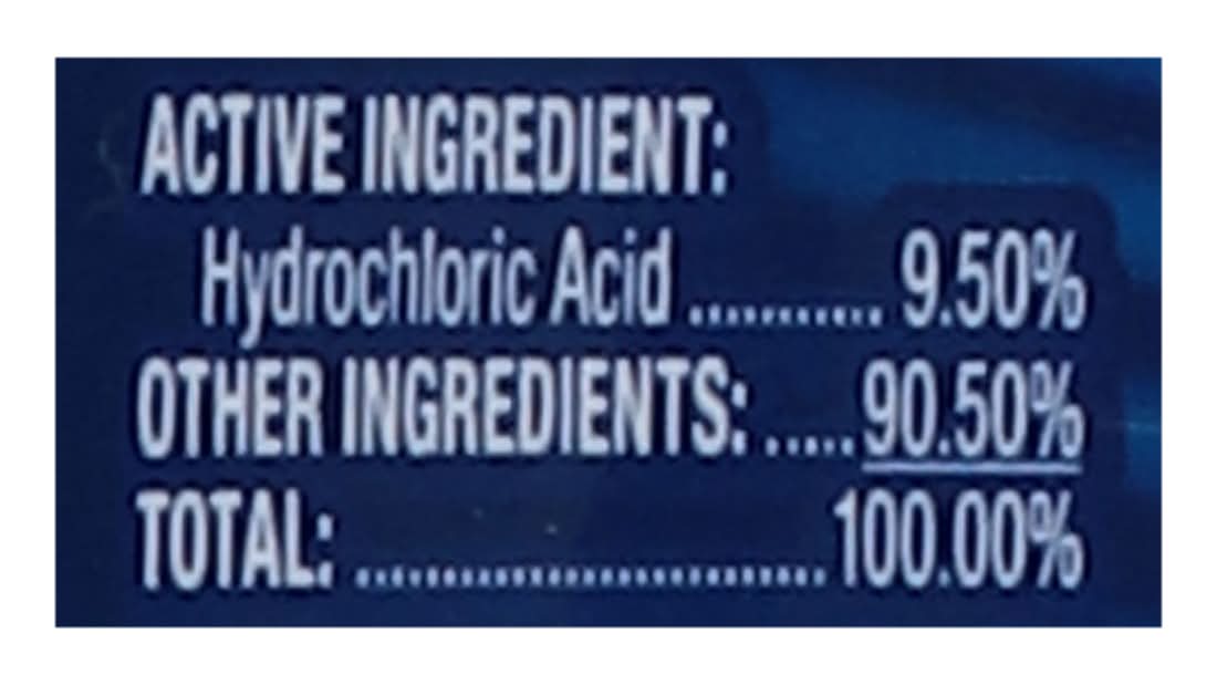 Ingredients: Active Ingredients: Hydrochloric Acid - 9.50%; Other Ingredients: 90.50%; Total - 100.00%