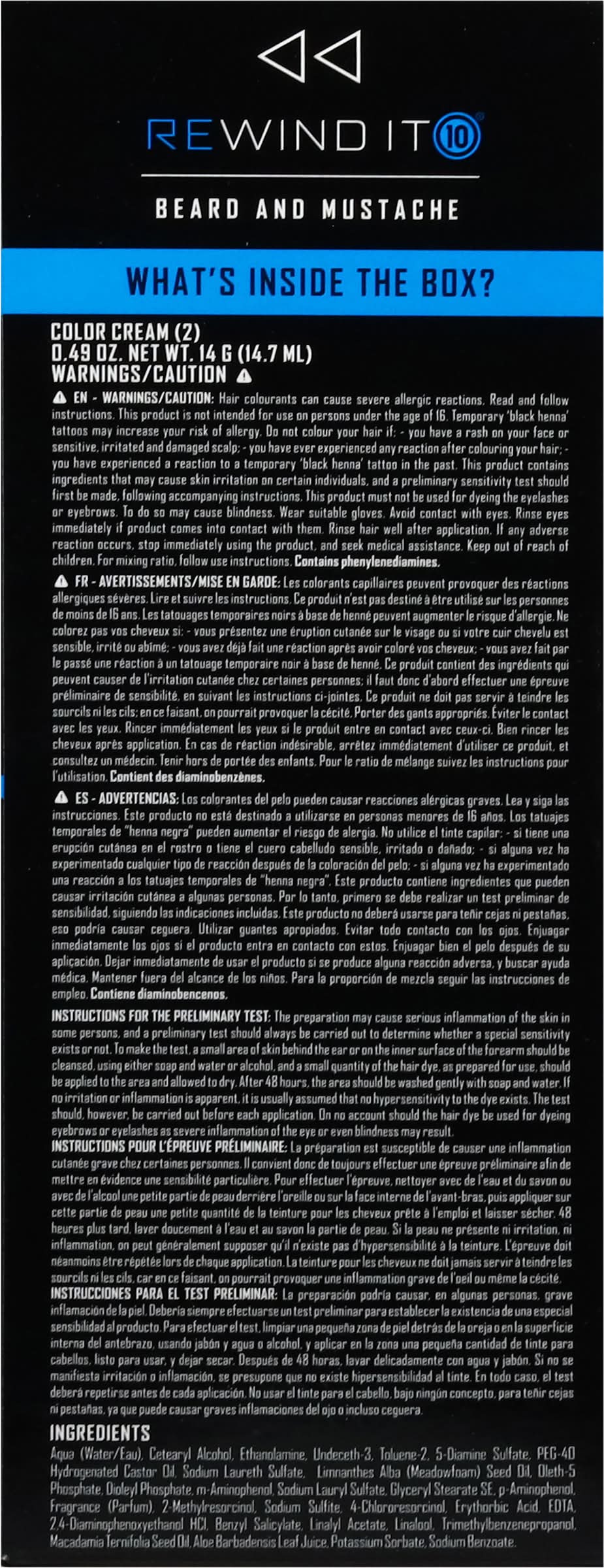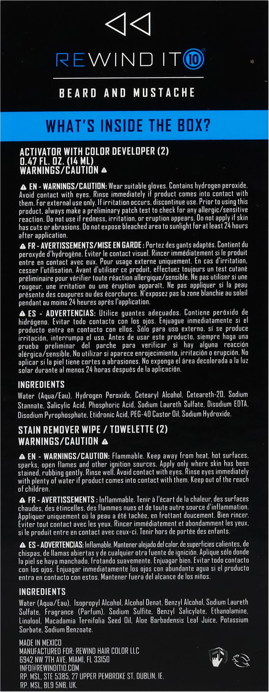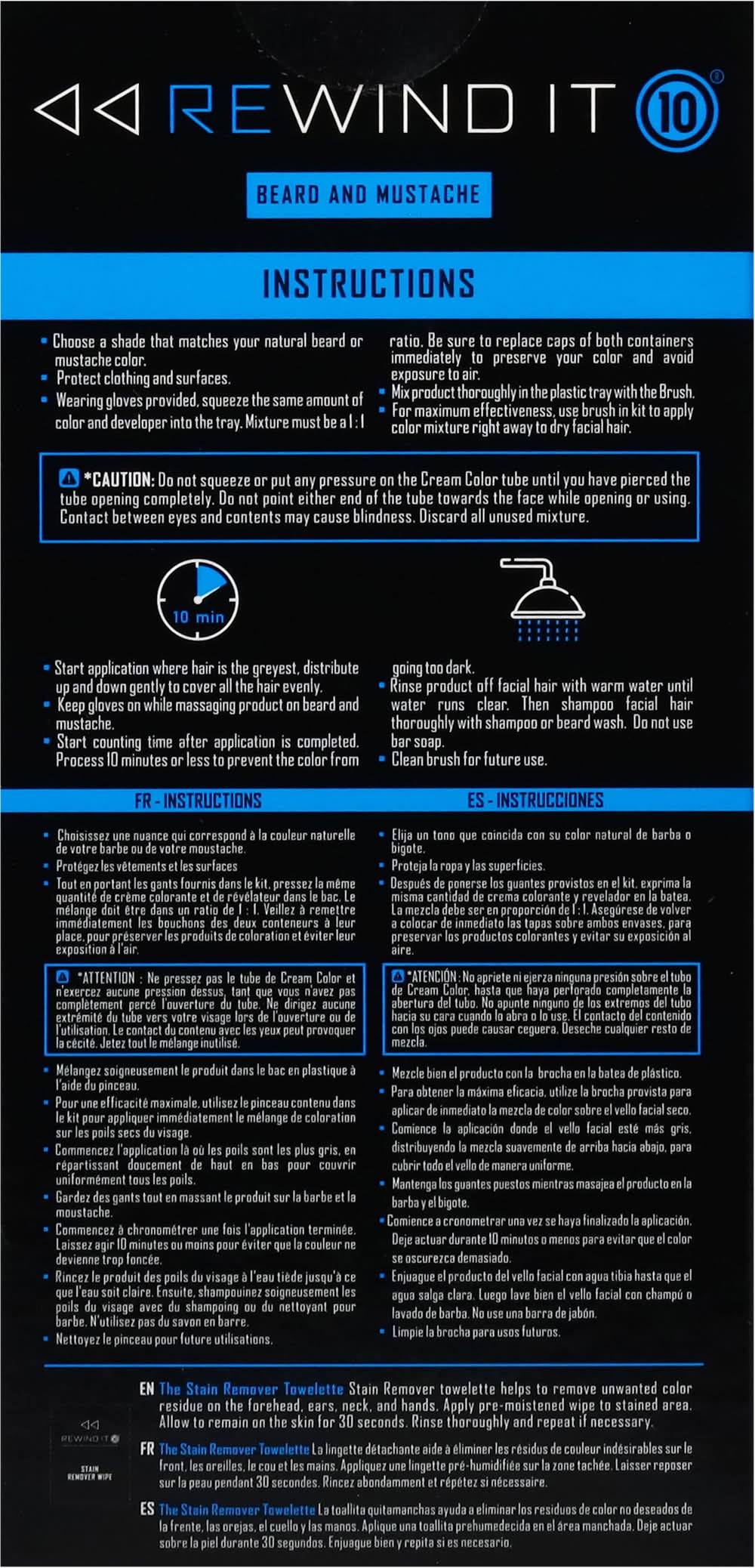 Instructions: choose a shade that matches your natural beard or mustache color. protect clothing and surfaces. wearing gloves provided. squeeze the same amount of color and developer into the tray. mixture must be a 1:1 ratio. be sure to replace caps of both containers immediately to preserve your color and avoid exposure to air. mix product thoroughly in the plastic tray with the brush. for maximum effectiveness, use brush in kit to apply color mixture right away to dry facial hair. start application where hair is the greyest, distribute up and down gently to cover all the hair evenly. keep gloves on while massaging product on beard and mustache. start counting time after application is completed. process 10 minutes or less to prevent the color from going too dark. rinse product off facial hair with warm water until water runs clear. then shampoo facial hair thoroughly with shampoo or beard wash. do not use bar soap. clean brush for future use. the stain remover towelette stain remover towelette helps to remove unwanted color residue on the forehead, ears, neck, and hands. apply pre-moistened wipe to stained area. allow to remain on the skin for 30 seconds. rinse thoroughly and repeat if necessary.