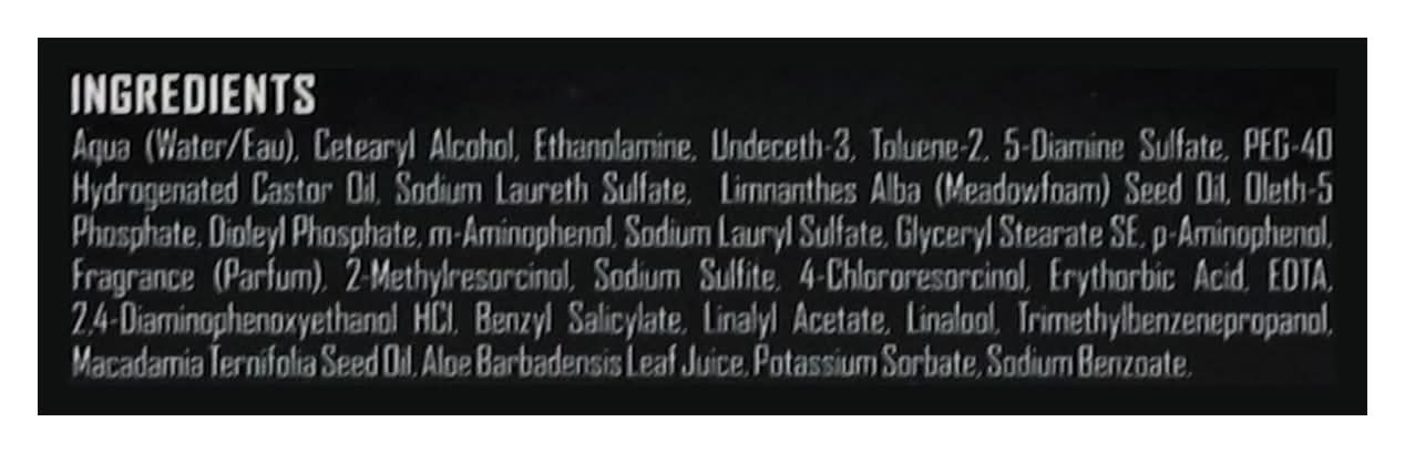 Ingredients: Color Cream (2): Aqua (Water/Eau), Cetearyl Alcohol, Ethanolamine, Undeceth-3, Toluene-2, 5-Diamine Sulfate, PEG-40 Hydrogenated Castor Oil, Sodium Laureth Sulfate, Limnanthes Alba (Meadowfoam) Seed Oil, Oleth-5 Phosphate, Dioleyl Phosphate, M-Aminophenol, Sodium Lauryl Sulfate, Glyceryl Stearate SE, P-Aminophenol, Fragrance (Parfum), 2-Methylresorcinol, Sodium Sulfite, 4-Chlororesorcinol, Erythorbic Acid, EDTA, 2.4-Diaminophenoxyethanol HCl, Benzyl Salicylate, Linalyl Acetate, Linalool, Trimethylbenzenepropanol, Macadamia Ternifolia Seed Oil, Aloe Barbadensis Leaf Juice, Potassium Sorbate, Sodium Benzoate. Activator with Color Developer (2): Water (Aqua/Eau), Hydrogen Peroxide, Cetearyl Alcohol, Ceteareth-20, Sodium Stannate, Salicylic Acid, Phosphoric Acid, Sodium Laureth Sulfate, Disodium EDTA, Disodium Pyrophosphate, Etidronic Acid, PEG-40 Castor Oil, Sodium Hydroxide. Stain Remover Wipe/Towelette (2): Water (Aqua/Eau), Isopropyl Alcohol, Alcohol Denat, Benzyl Alcohol, Sodium Laureth Sulfate, Fragrance (Parfum), Sodium Sulfite, Benzyl Salicylate, Ethanolamine, Linalool, Macadamia Ternifolia Seed Oil, Aloe Barbadensis Leaf Juice, Potassium Sorbate, Sodium Benzoate Contains: Tree Nuts, Macadamia Nuts, Sulfites