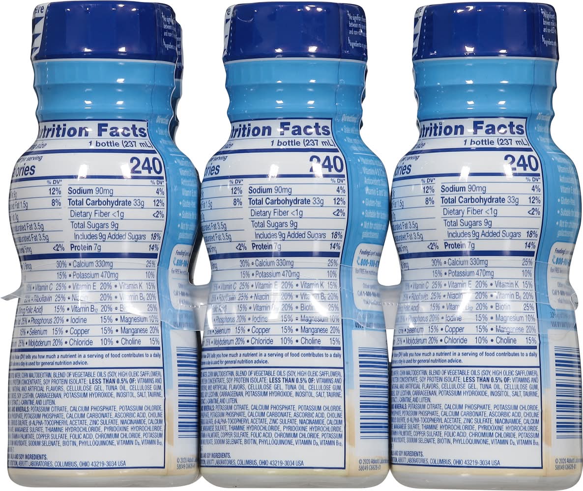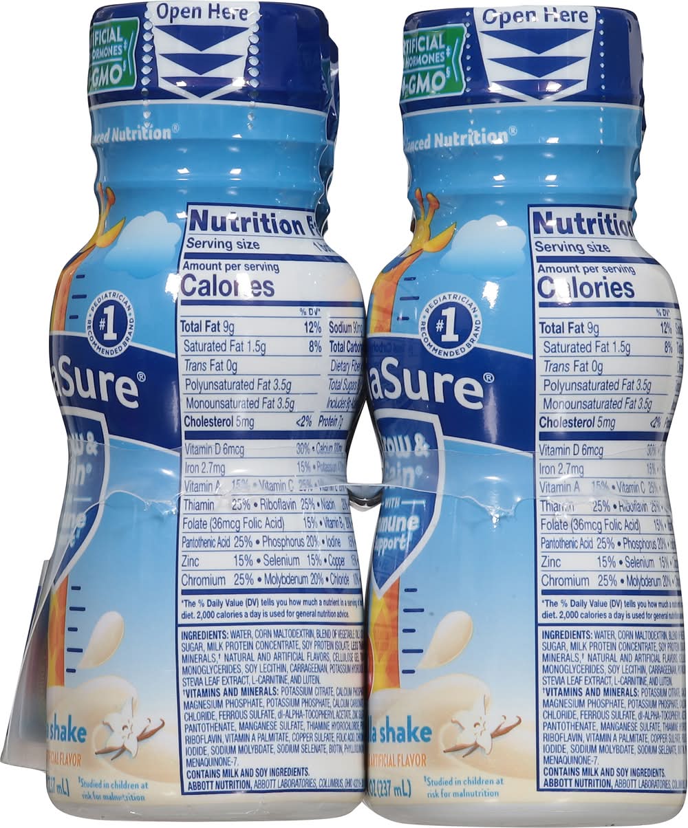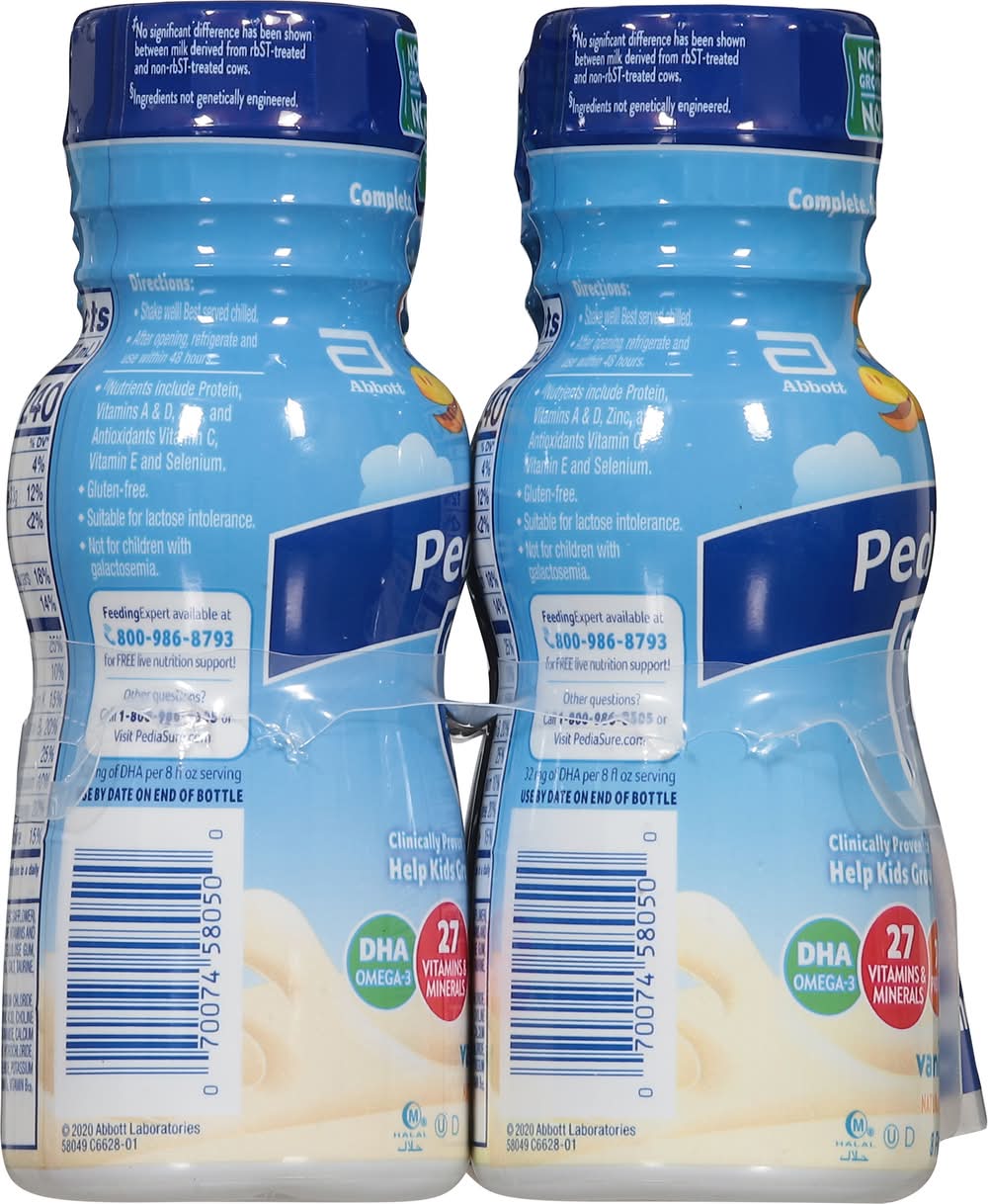 PediaSure Grow & Gain with Immune Support kids nutritional shakes are clinically proven† to help kids grow. Each shake has 7 key nutrients for immune support, 27 essential vitamins and minerals, 7g of protein to help build muscles, and 32mg of DHA omega-3 for brain & eye development. PediaSure Grow & Gain is non-GMO, gluten-free, has no artificial growth hormones,§ and is suitable for lactose intolerance. Not for children with galactosemia. Nutrients include protein, vitamins A & D, zinc, and antioxidants (vitamins C & E and selenium). Studied in children at risk for malnutrition. Ingredients not genetically engineered. No significant difference has been shown between milk derived from rbST-treated and non-rbST-treated cows. In children ages 3-4 at nutritional risk (5th-25th weight-for-height percentiles), when given 2 servings per day and dietary counseling. • Flavor: Vanilla • Pack size: 6 • Abbott Nutrition, Columbus, OH