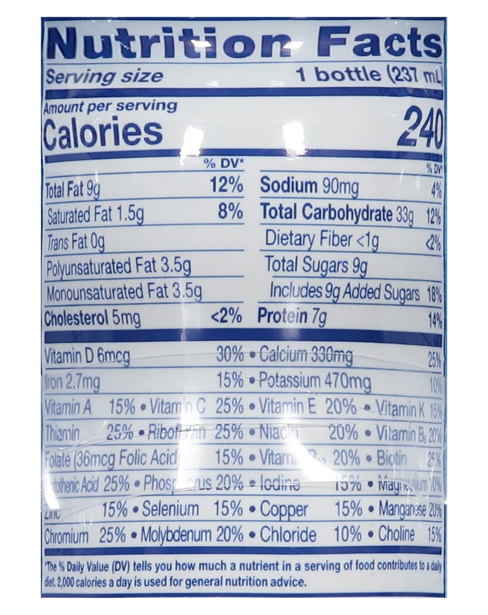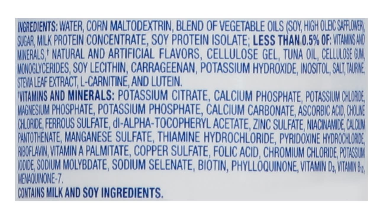 Ingredients: Water, Corn Maltodextrin, Blend of Vegetable Oils (Soy, High Oleic Safflower), Sugar, Milk Protein Concentrate, Soy Protein Isolate; Less than 0.5% of: Vitamins and Minerals (a), Natural and Artificial Flavors, Cellulose Gel, Tuna Oil, Cellulose Gum, Monoglycerides, Soy Lecithin, Carrageenan, Potassium Hydroxide, Inositol, Salt, Taurine, Stevia Leaf Extract, L-Carnitine, and Lutein. (a) Vitamins and Minerals: Potassium Citrate, Calcium Phosphate, Potassium Chloride, Magnesium Phosphate, Potassium Phosphate, Calcium Carbonate, Ascorbic Acid, Choline Chloride, Ferrous Sulfate, DL-Alpha-Tocohperyl Acetate, Zinc Sulfate, Niacinamide, Calcium Pantothenate, Manganese Sulfate, Thiamine Hydrochloride, Pyridoxine Hydrochloride, Riboflavin, Vitamin A Palmitate, Copper Sulfate, Folic Acid, Chromium Chloride, Potassium Iodide, Sodium Molybdate, Sodium Selenate, Biotin, Phylloquinone, Vitamin D3, Vitamin B12, Menaquinone-7 Contains: Milk, Soybeans, Fish