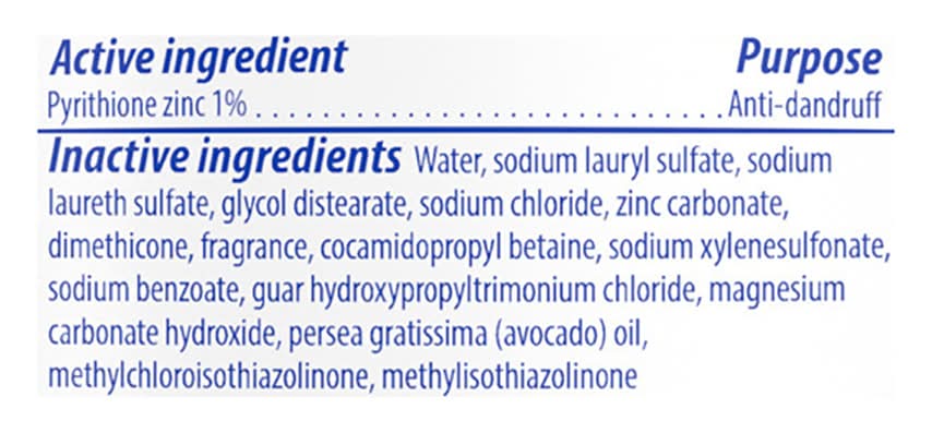 Ingredients: Active Ingredients: Pyrithione Zinc (1 %), Anti-Dandruff. Inactive Ingredients: Water, Sodium Lauryl Sulfate, Sodium Laureth Sulfate, Glycol Distearate, Sodium Chloride, Zinc Carbonate, Dimethicone, Fragrance, Cocamidopropyl Betaine, Sodium Xylenesulfonate, Sodium Benzoate, Guar Hydroxypropyltrimonium Chloride, Magnesium Carbonate Hydroxide, Persea Gratissima (Avocado) Oil, Methylchloroisothiazolinone, Methylisothiazolinone